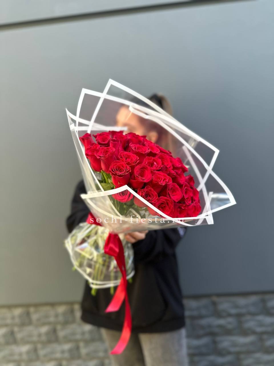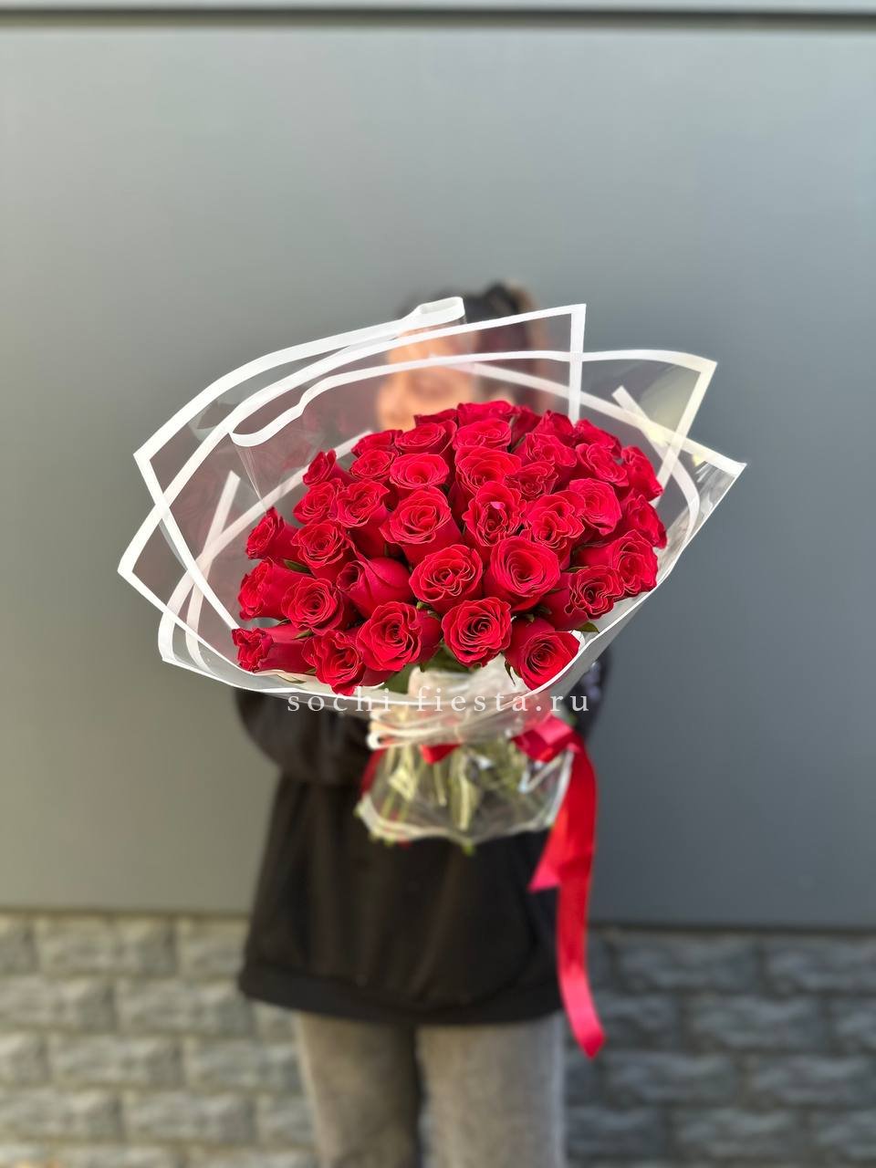 Сто один бутон образует плотную красную сферу с безупречной геометрией. Кенийская роза отличается густотой лепестков и насыщенным оттенком который не теряет глубину даже при ярком свете. Букет держит форму и впечатляет масштабом.