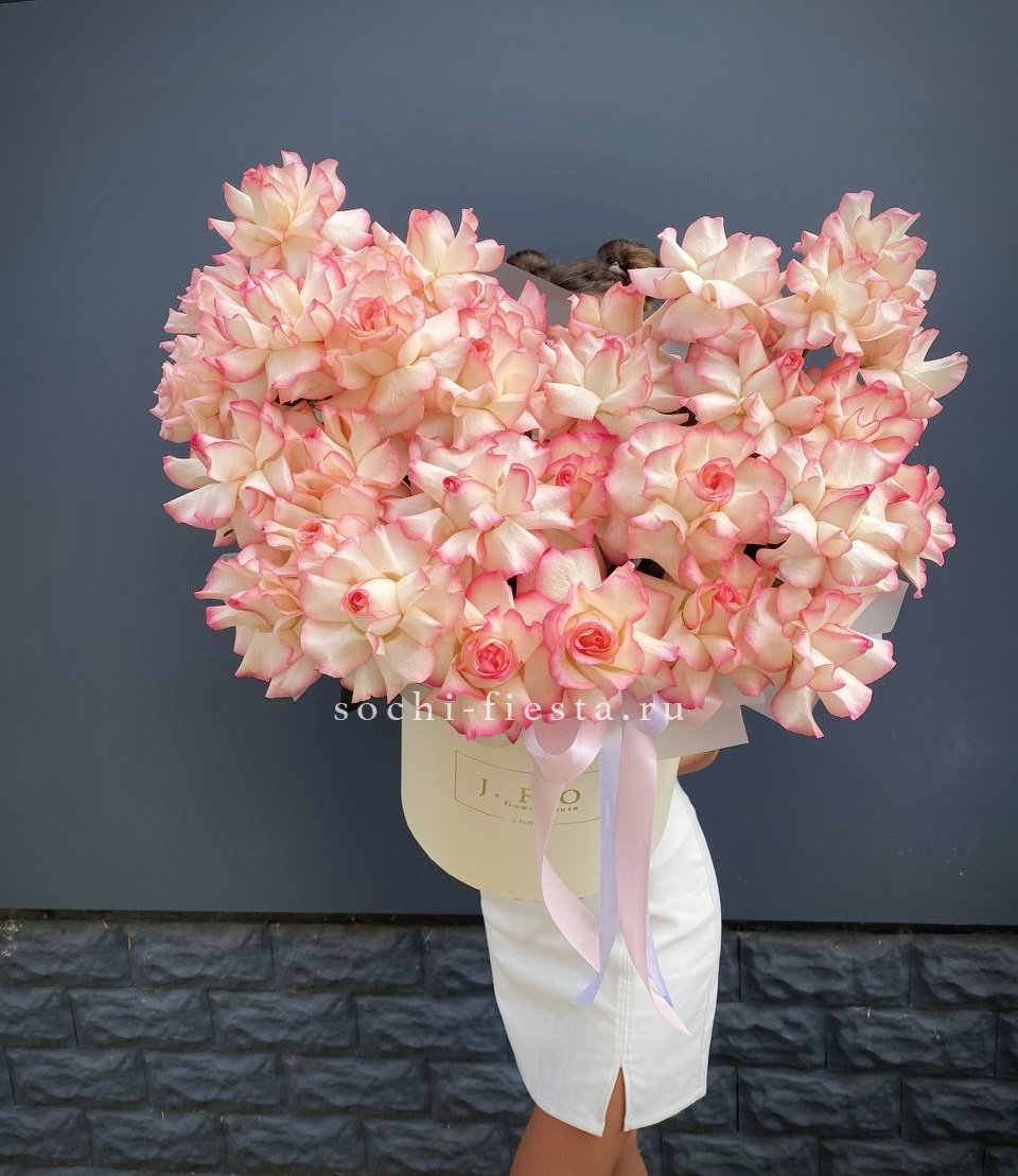 Одиннадцать кустовых роз с густыми многолепестковыми бутонами в нежно-розовой гамме. Каждая ветка раскрывается несколькими головками, создавая пышную объемную форму. Для тех, кто любит выразительные букеты с характером.
