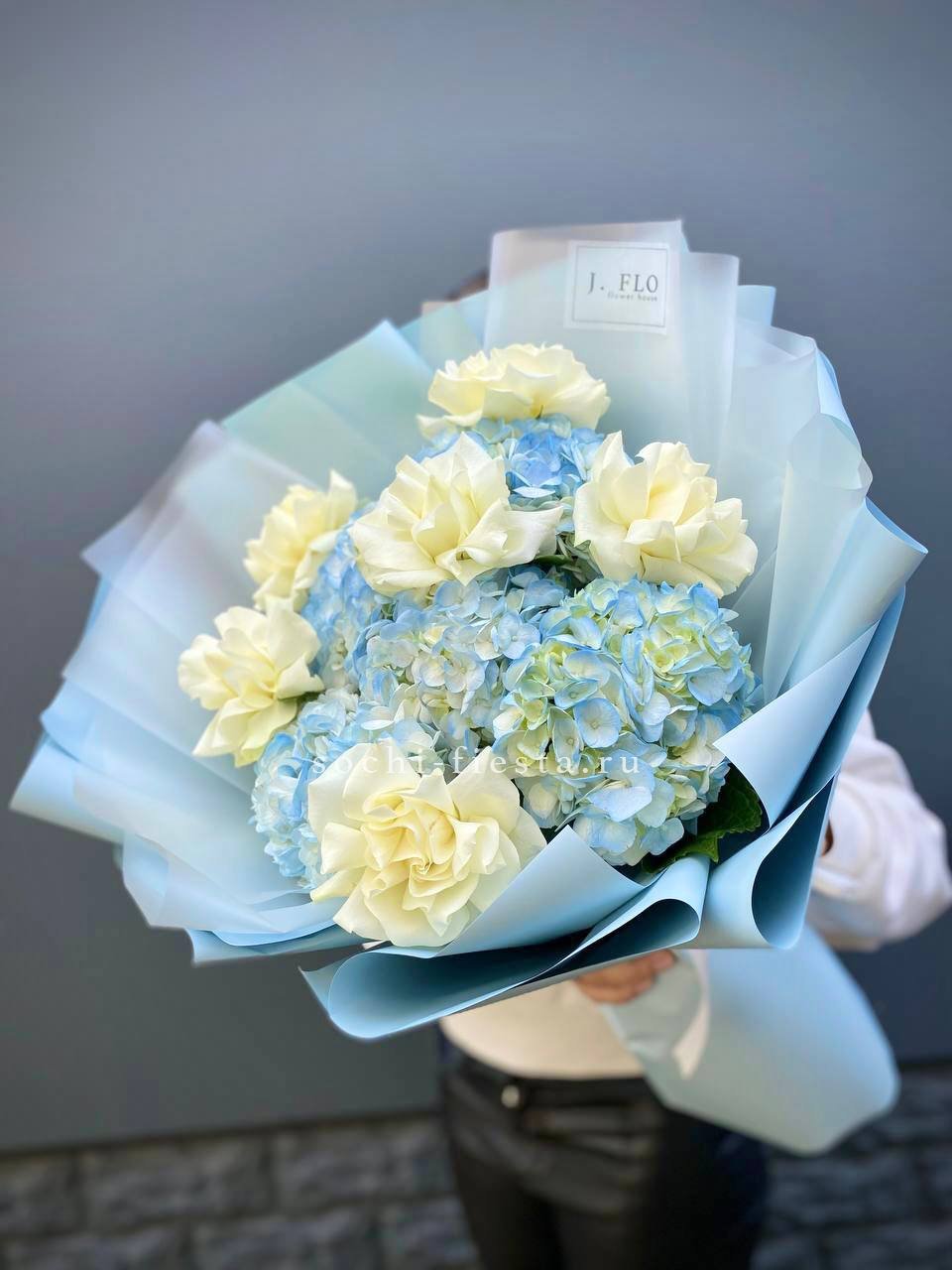 Пять соцветий необычного голубого оттенка образуют воздушную композицию. Гортензии притягивают взгляд своей редкой палитрой и мягкой фактурой. Монобукет для ценителей нестандартных решений.