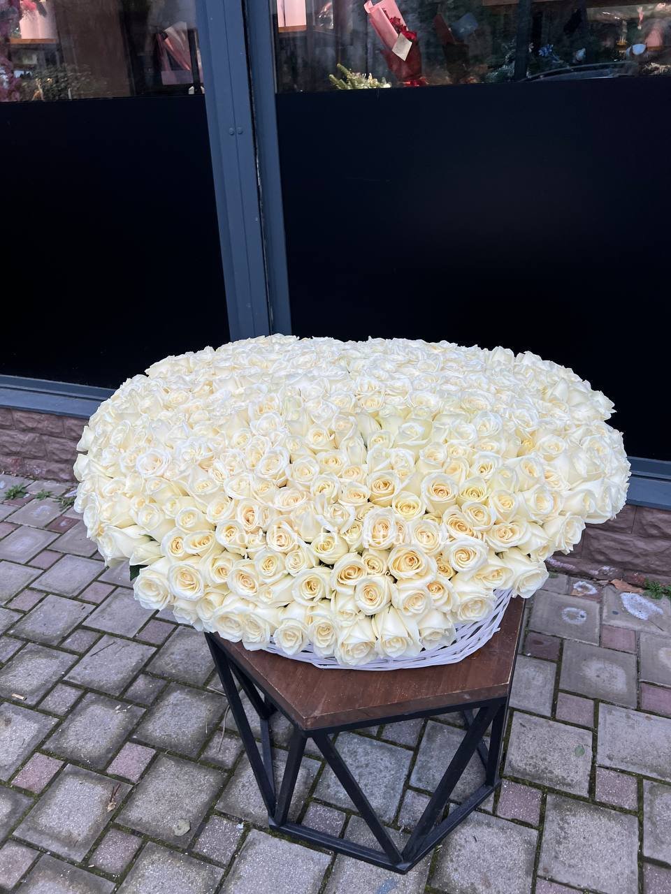Пятьсот один бутон выстроены плотными рядами в глубокой корзине. Белоснежная композиция создаёт эффект цветочного облака, способного заполнить собой всё пространство вокруг.