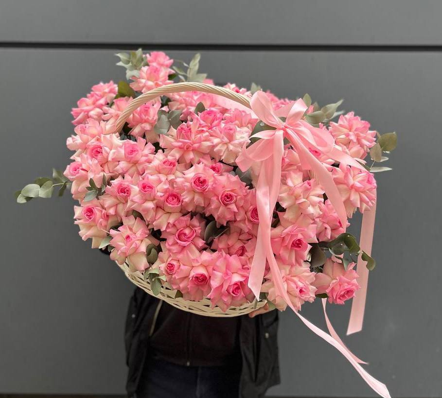 розовые розы, эвкалипт, пленка, корзина.