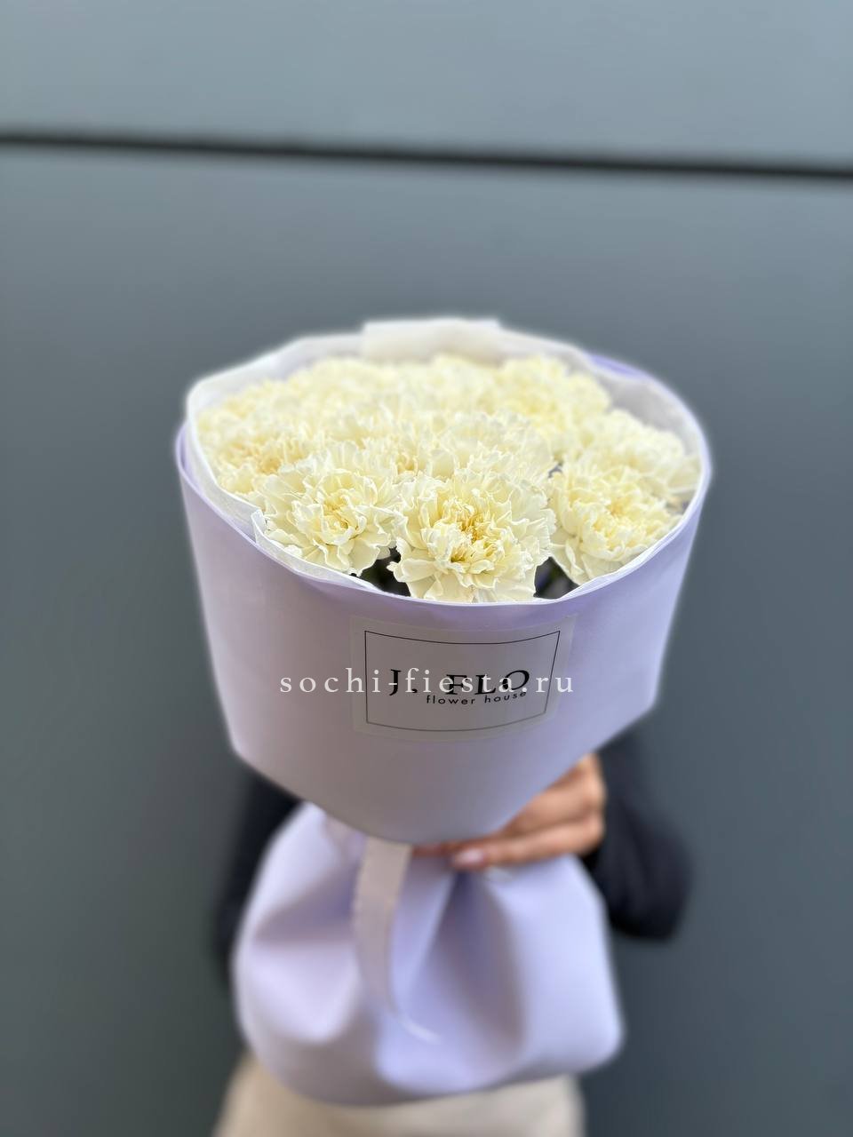 Белоснежные диантусы раскрываются плотными многослойными бутонами с резными краями лепестков. Каждый цветок создаёт объёмную текстуру и игру света на поверхности.