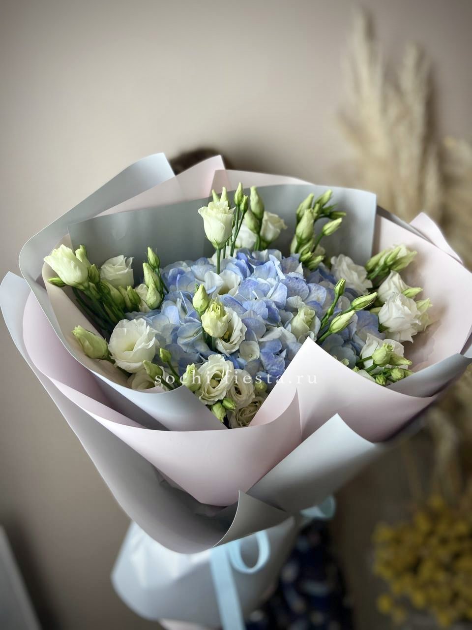 Три пышных шапки голубой гортензии образуют округлую форму с естественной асимметрией. Каждое соцветие раскрыто полностью, создавая впечатление объёмного облака в руках.