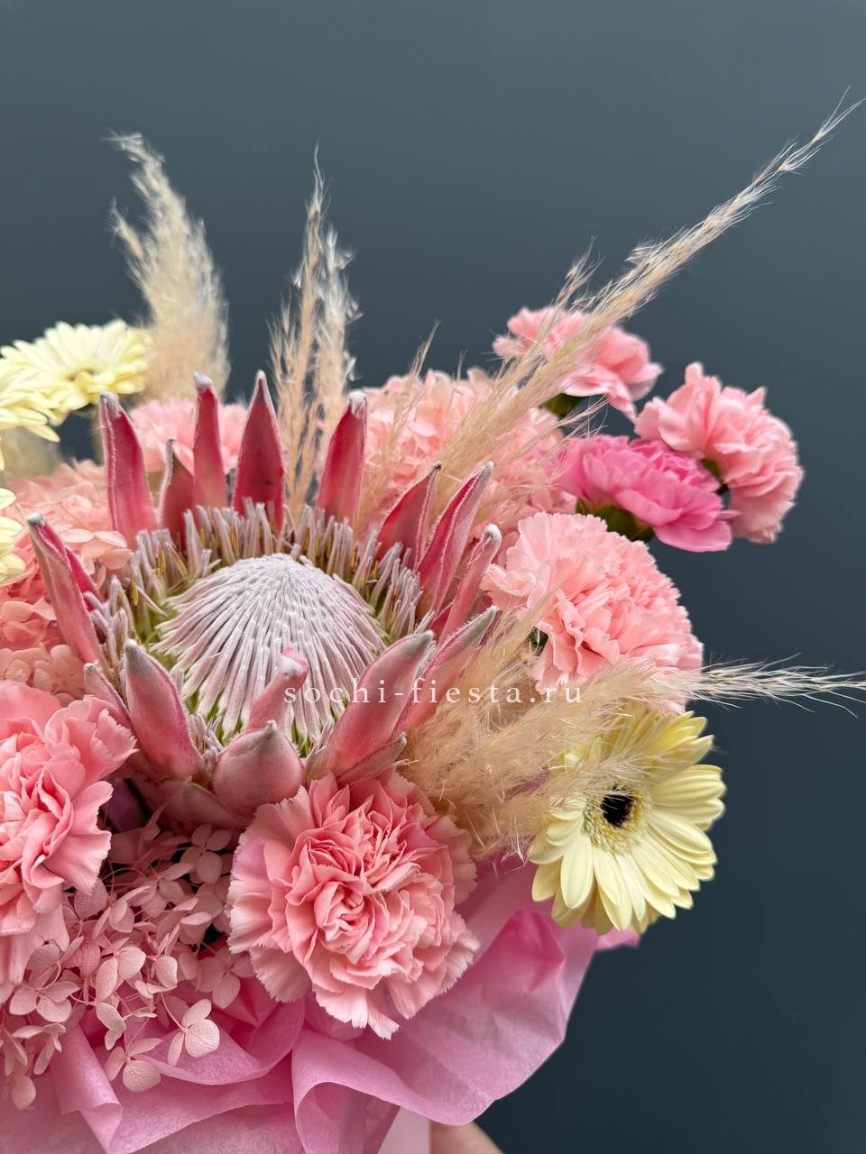 Пышная гортензия задаёт основной объём, а мелкие соцветия мисти баблс создают лёгкую дымку вокруг. Диантус и озотамнус дополняют фактуру мягкими переходами.
