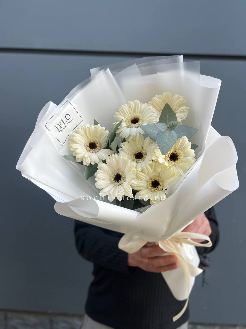 голландская гербера 7 шт., лента, дизайнерская упаковка Оттенок гербер может быть согласован с заказчиком.