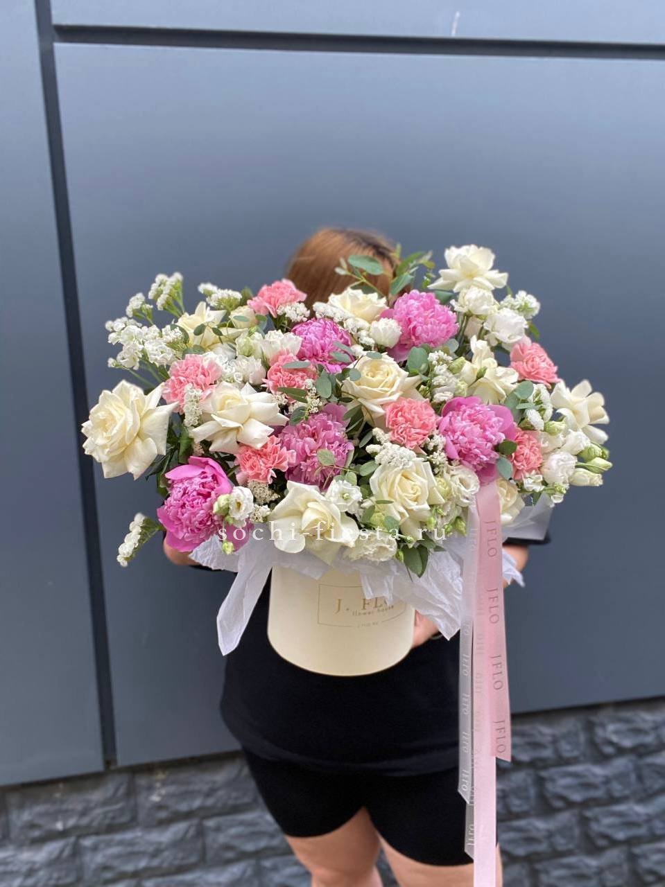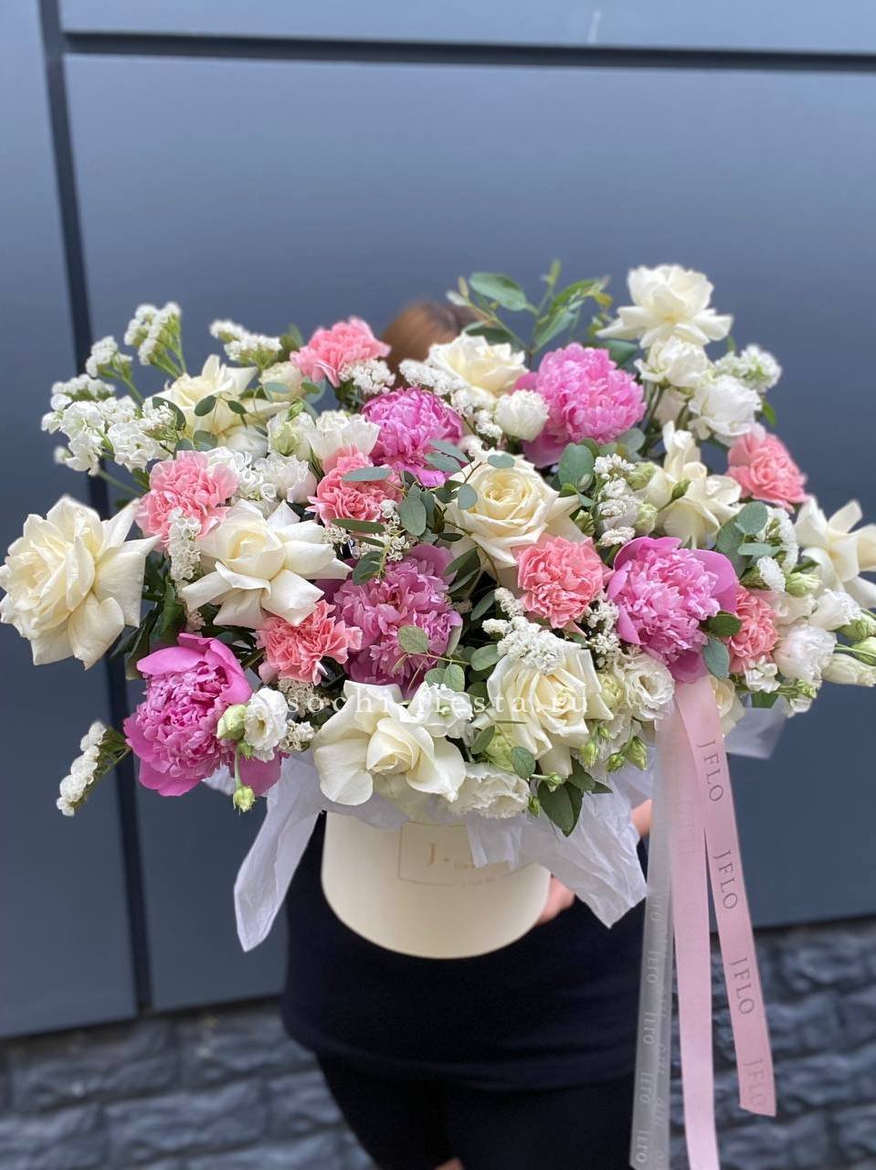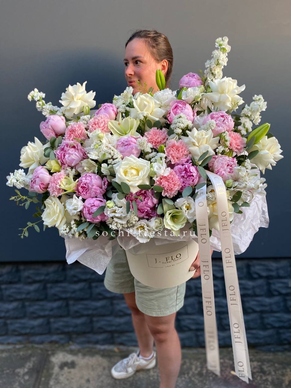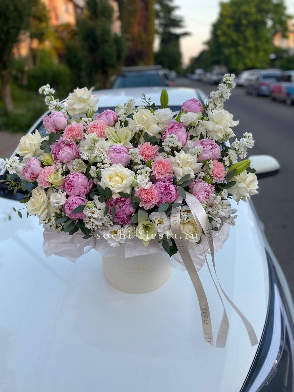 Голландские пионы и пышные шапки гортензий собраны в многослойную композицию. Разная фактура цветов создаёт визуальную игру между плотными бутонами и воздушными соцветиями.