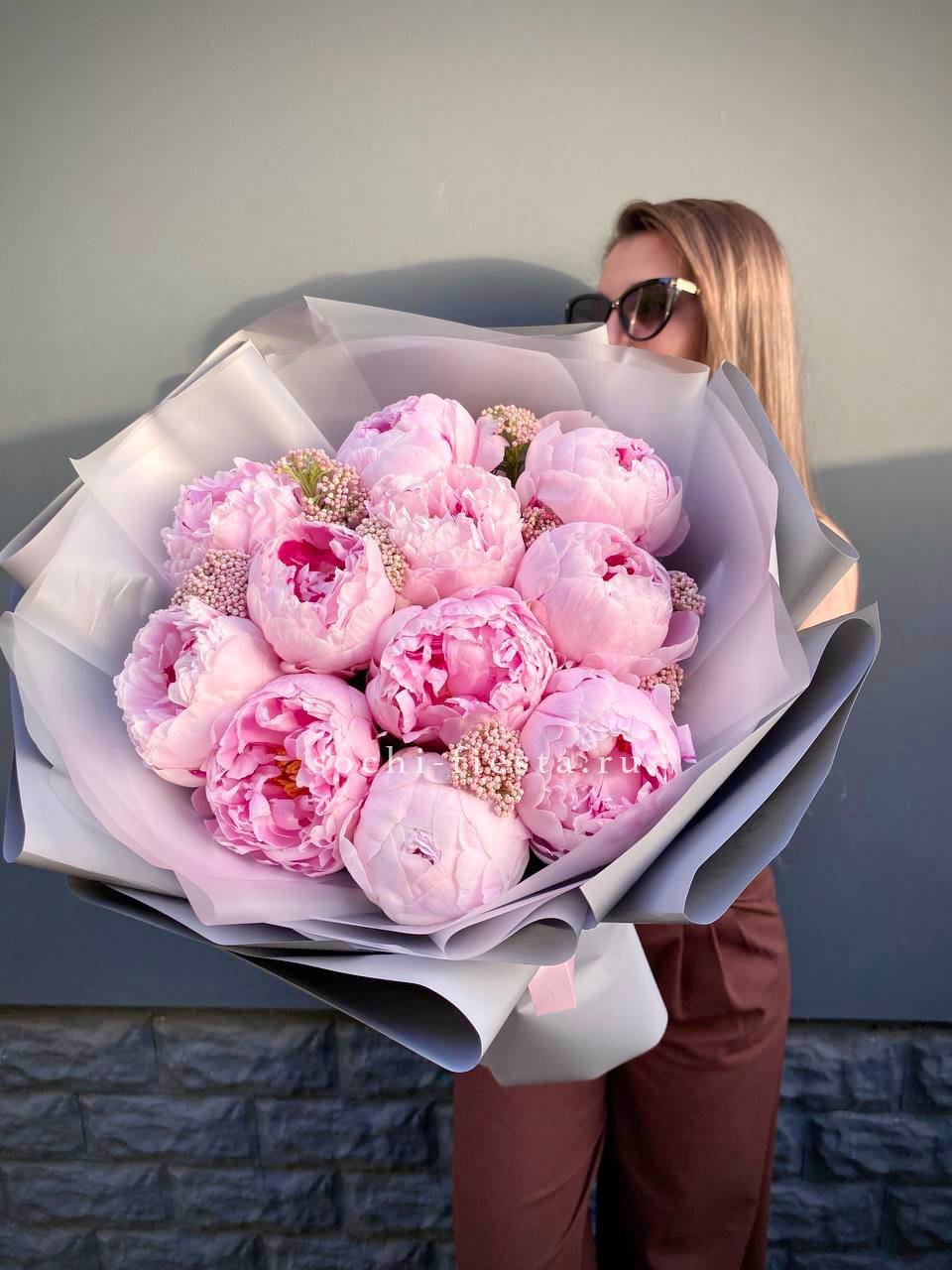 розовые пионы, озатамус, лента, дизайнерская упаковка.
