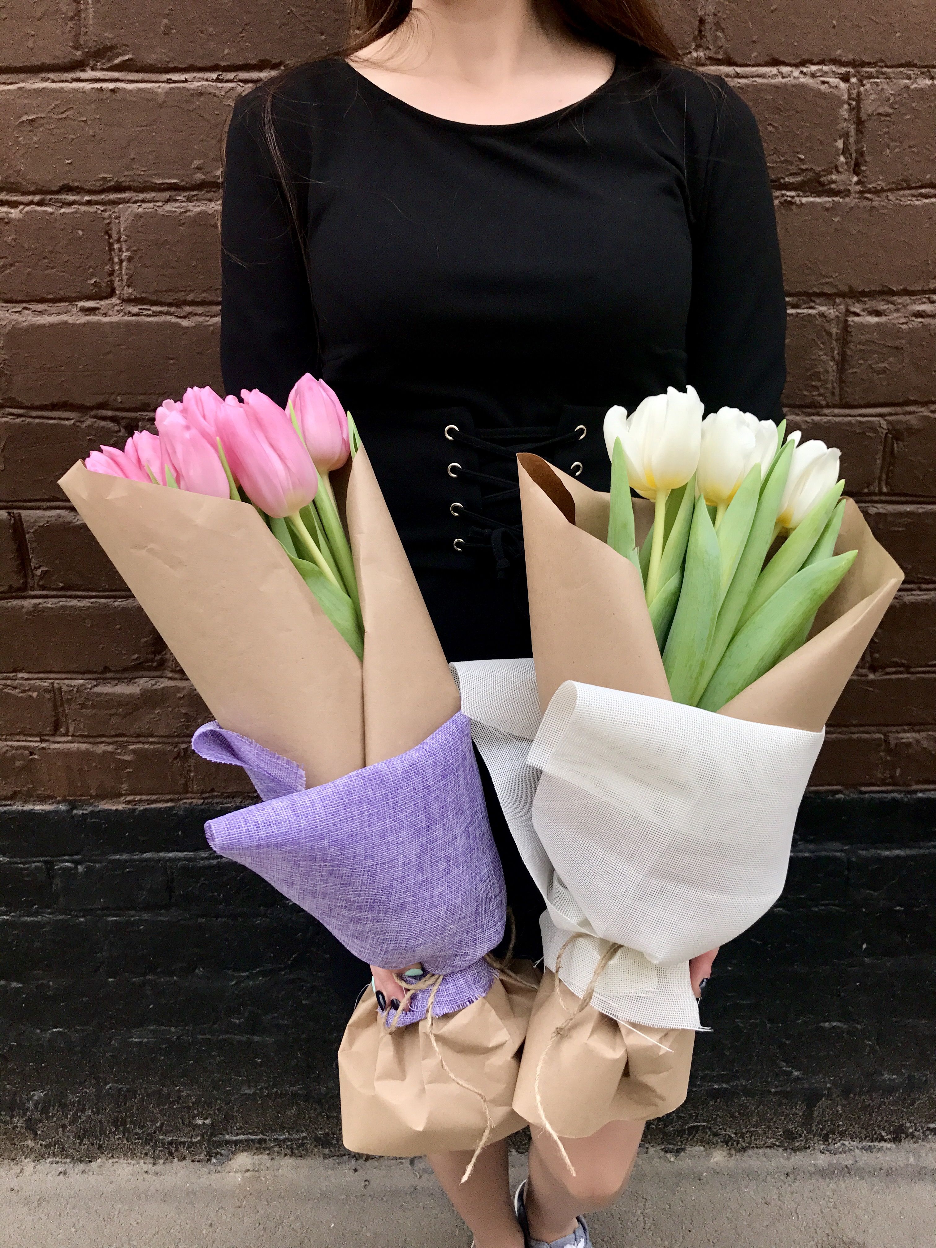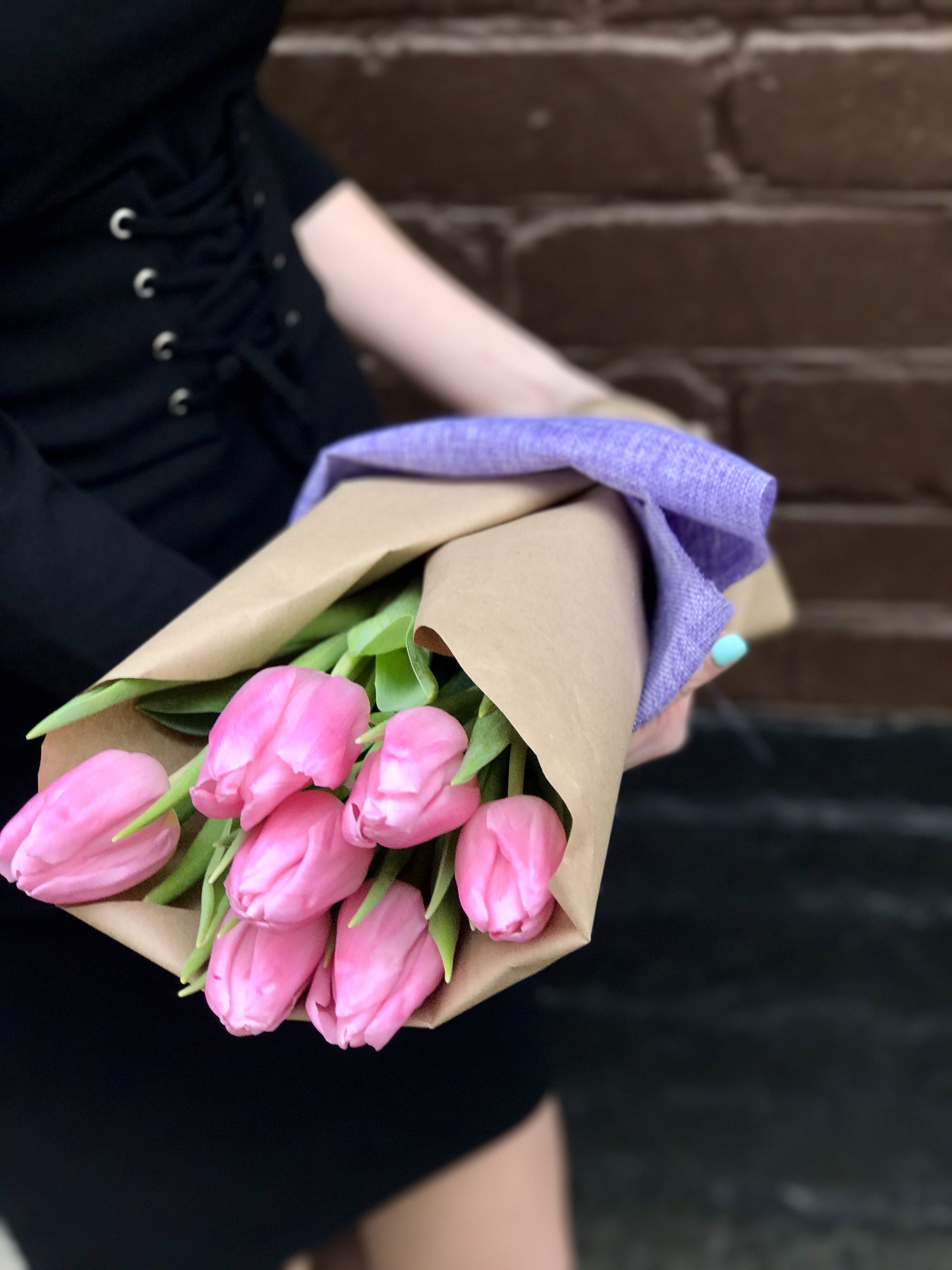 Семь тюльпанов собраны в компактный букет с мягкой текстурой лепестков. Розовый оттенок создает спокойное весеннее настроение. Упаковка из крафта и мешковины добавляет естественности.