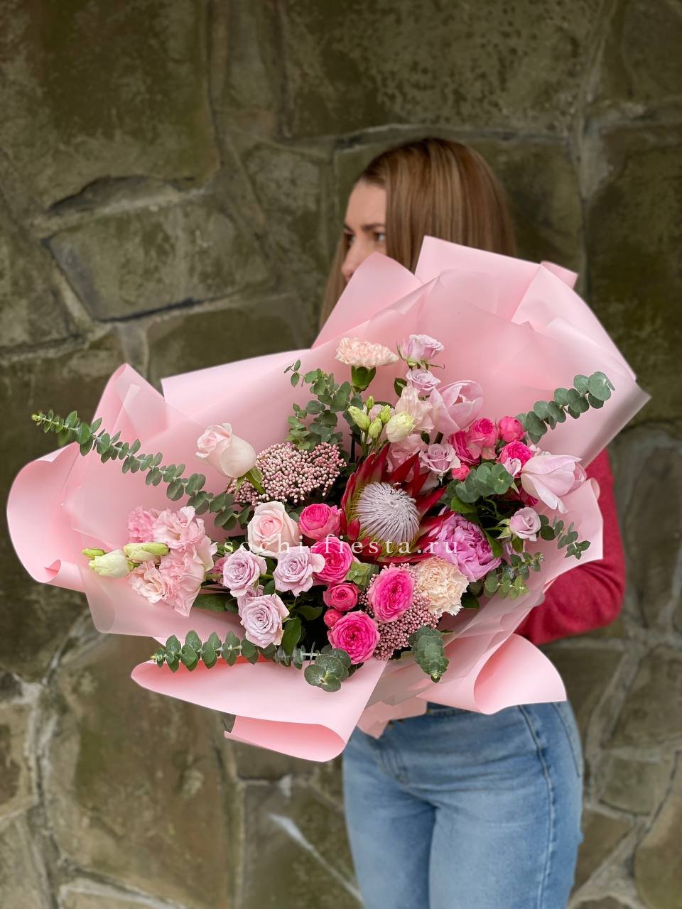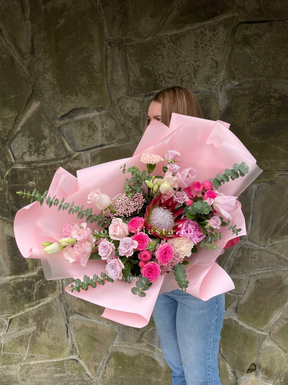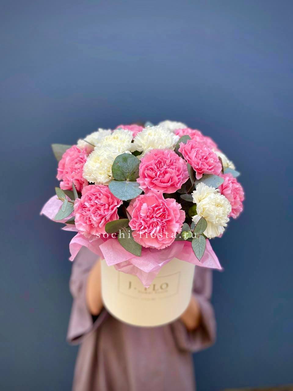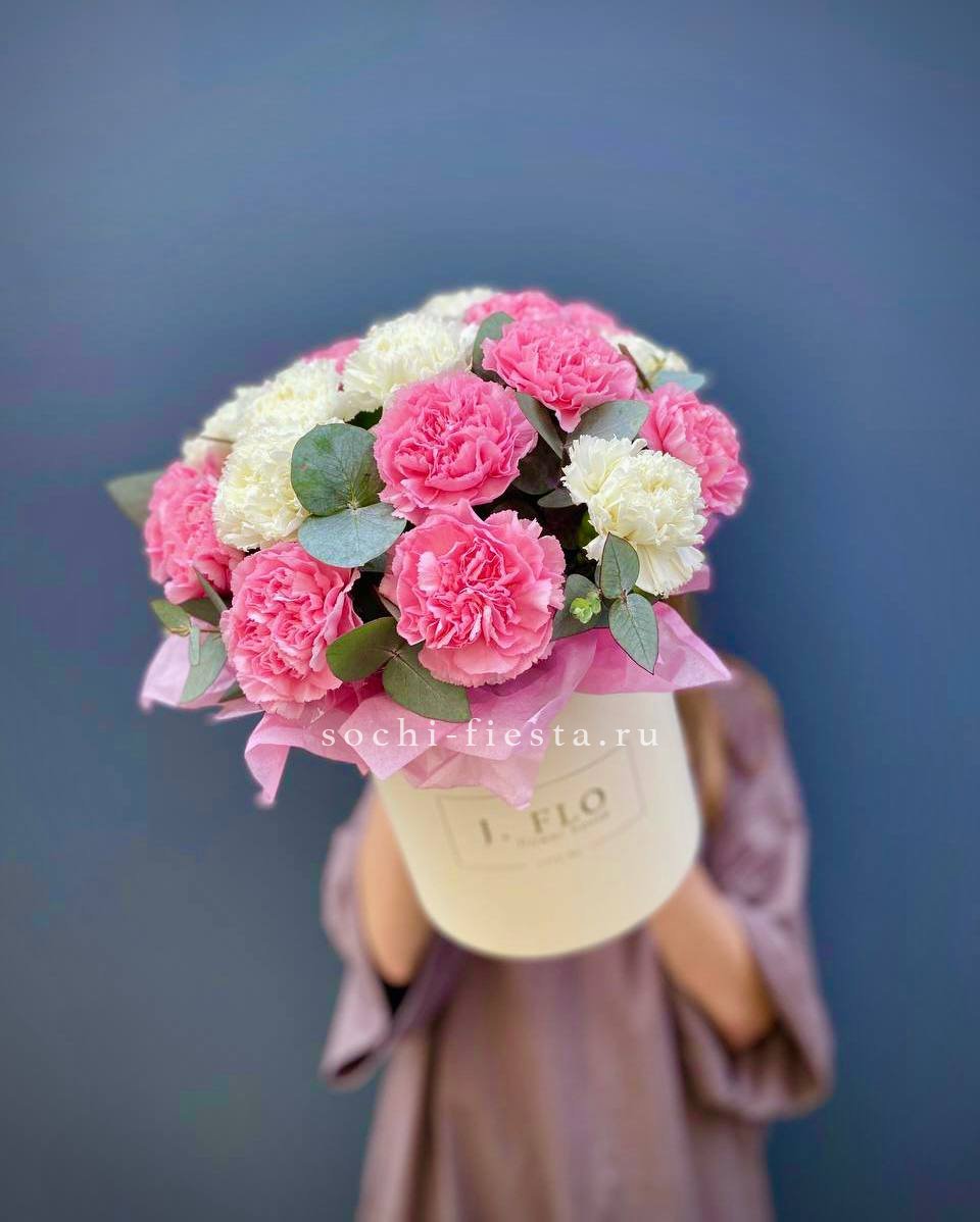 Пионовидные бутоны с волнистыми лепестками соседствуют с графичными диантусами и свежими ветками эвкалипта. Авторская упаковка завершает образ, добавляя композиции современное звучание.
