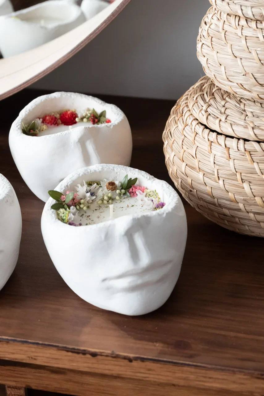 свеча из гипса, кокосовый воск 100% (экологично и не оставляет следов), украшена сухоцветами, время горения 30ч, аромат свечи не выветривается около года.