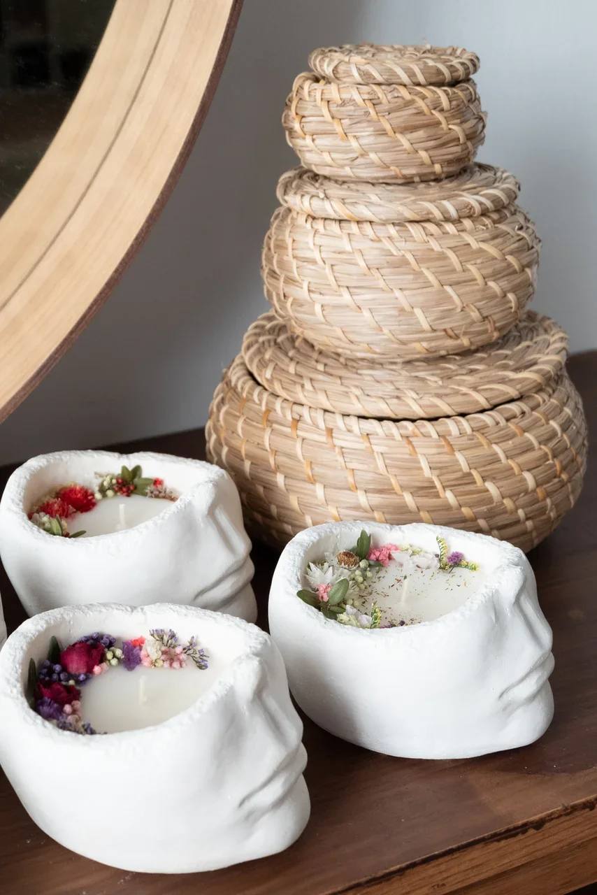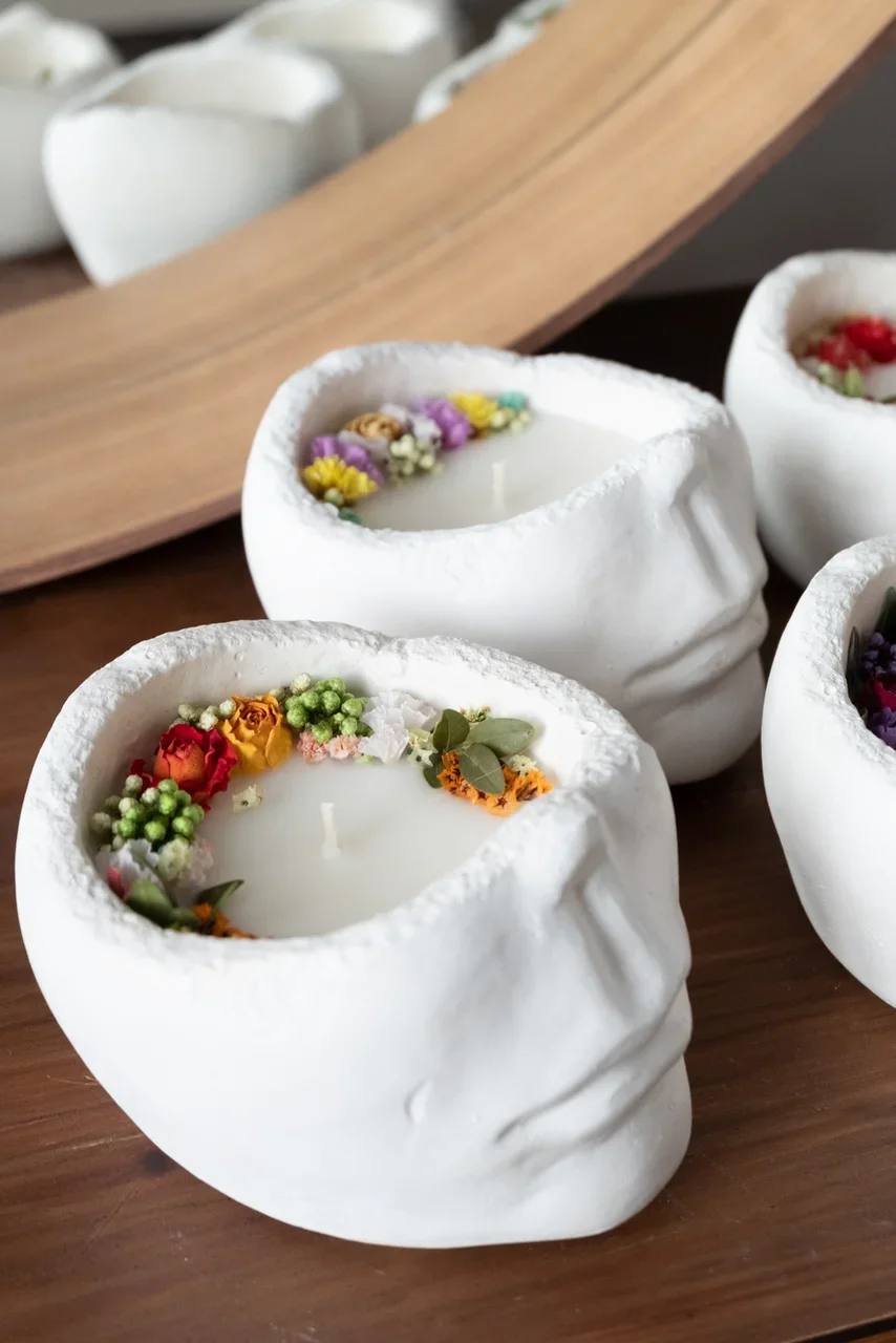 Гипсовая свеча с натуральным кокосовым воском горит до 30 часов и сохраняет аромат целый год. Сухоцветы в основании создают объёмную композицию, которая работает как декор даже без огня.