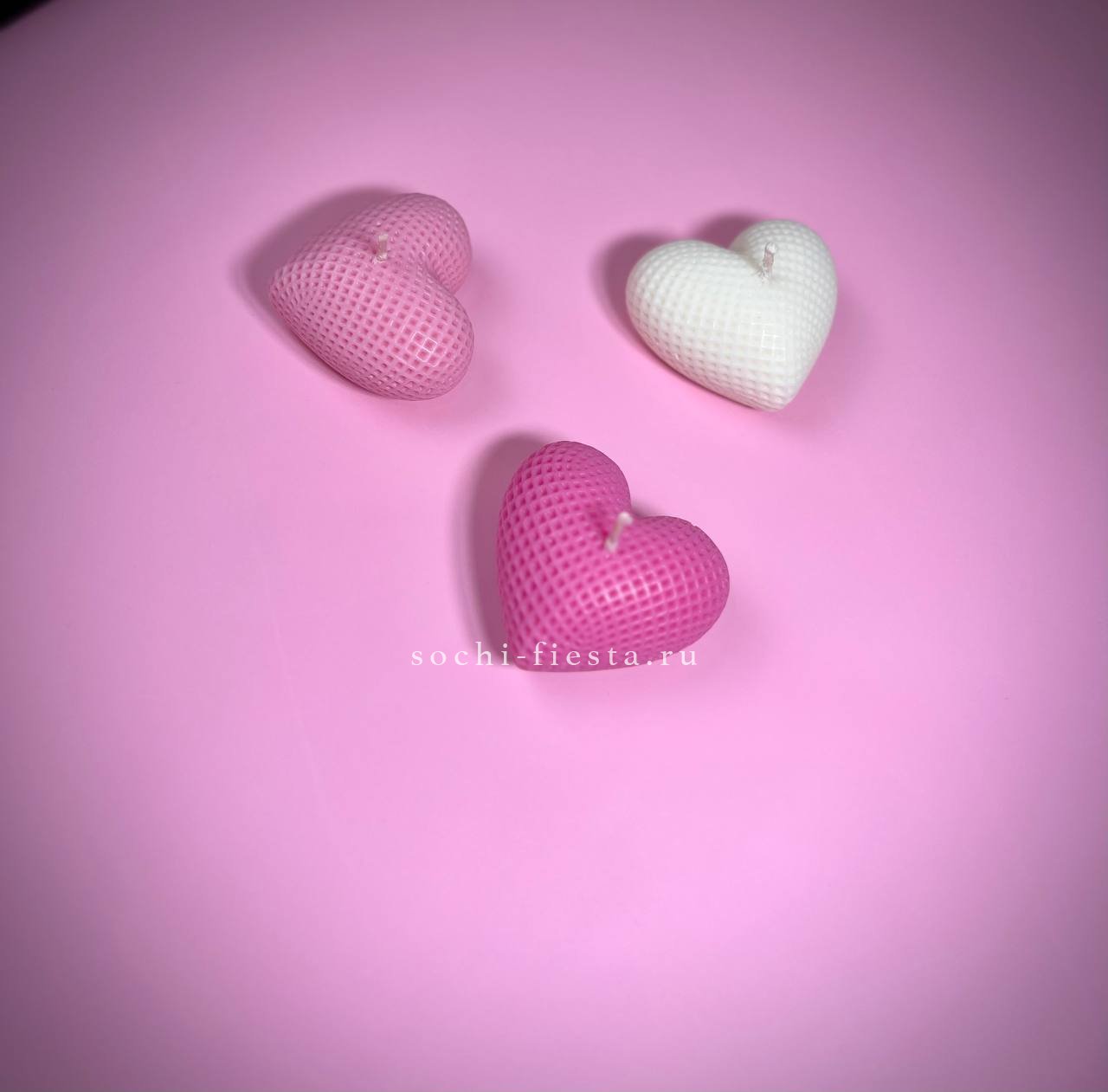 Три свечи в форме плюшевых сердец ручной работы. Мягкие линии и романтичная форма создают камерное настроение. Дополнение к цветам, которое продлит впечатление от подарка.