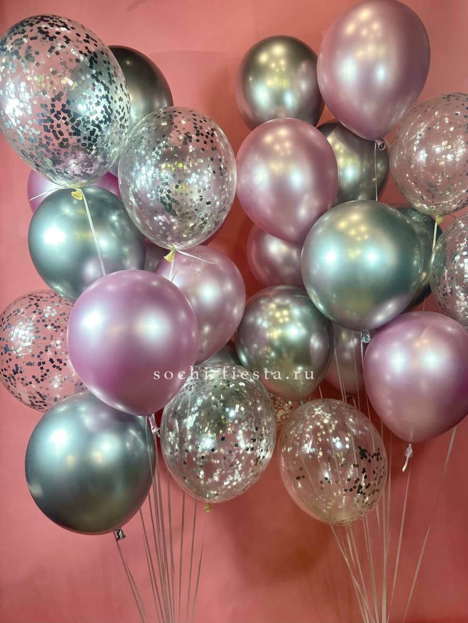 Серебро встречается с хромированным розовым в двух симметричных фонтанах. Прозрачные шары с конфетти добавляют глубину и движение всей связке из тридцати элементов.