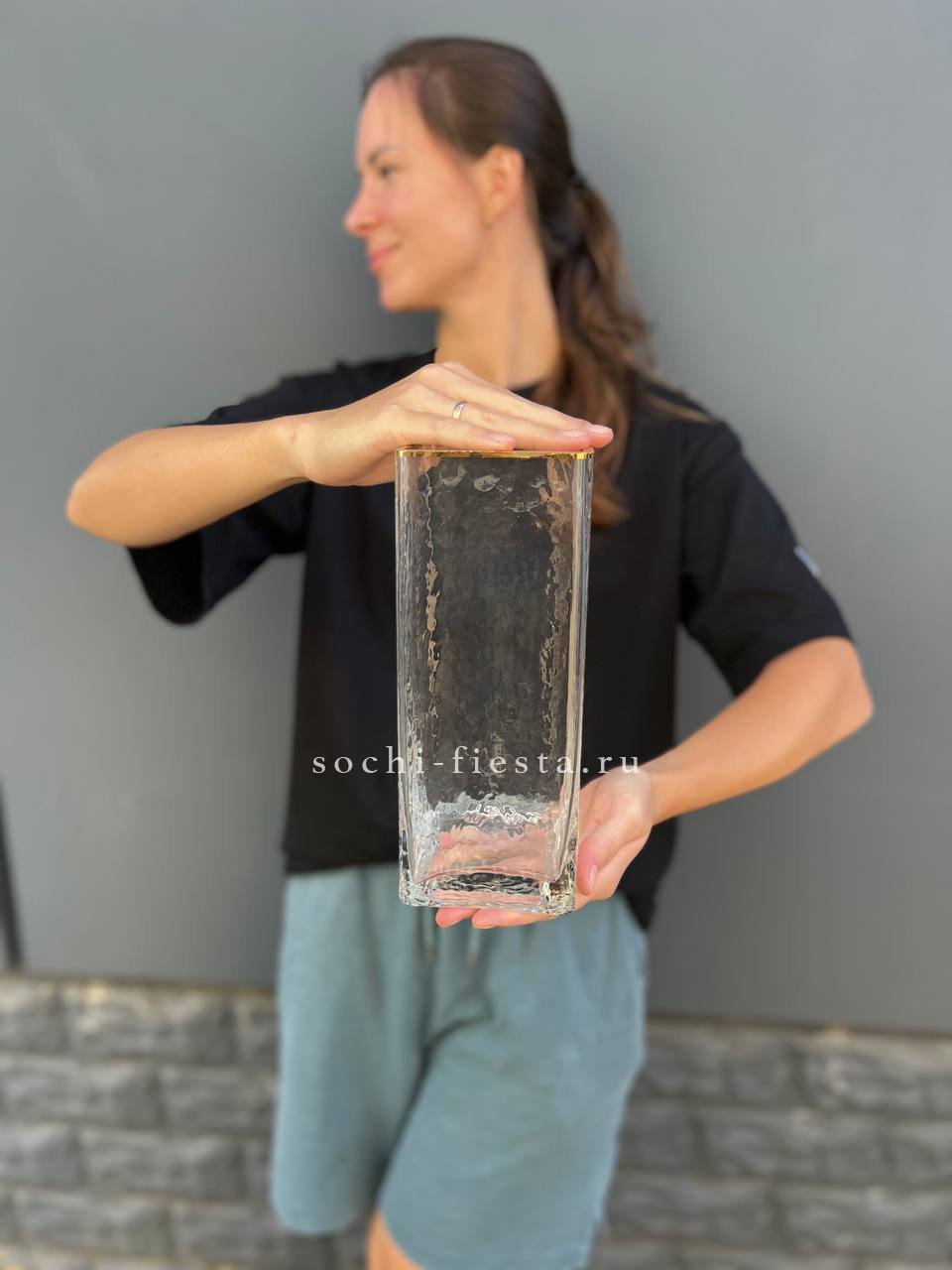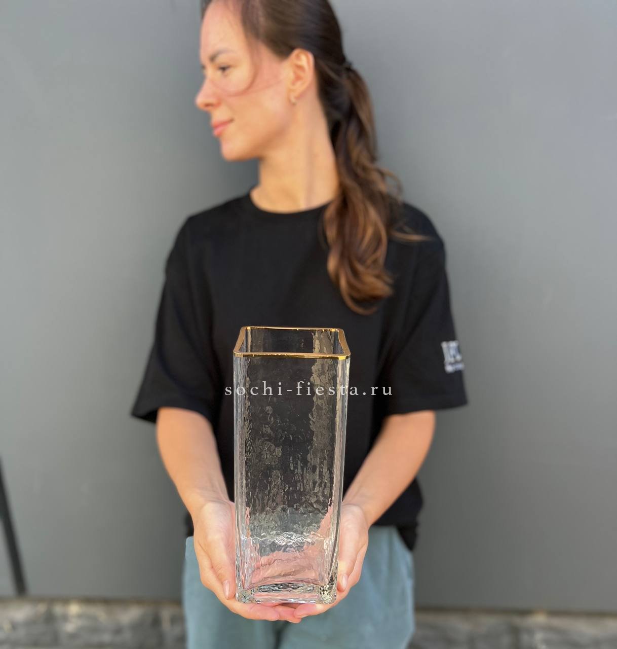 декоративная интерьерная ваза для цветов и сухоцветов с золотистой каймой – это идеальное сочетание элегантности и функциональности. Выполненная из высококачественного стекла, имеет прямоугольную форму, что придает ей современный и изысканный вид. Текстурированная поверхность добавляет изделию дополнительную глубину и интересные световые эффекты, создавая атмосферу уюта и роскоши. Объем 2,5 литра.