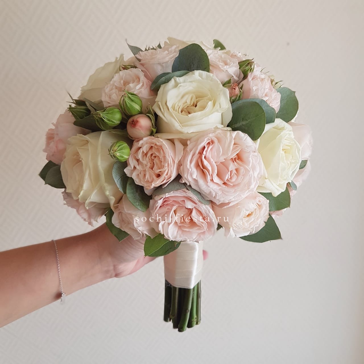 Розовый эвкалипт вносит неожиданный штрих в спокойную гамму композиции.