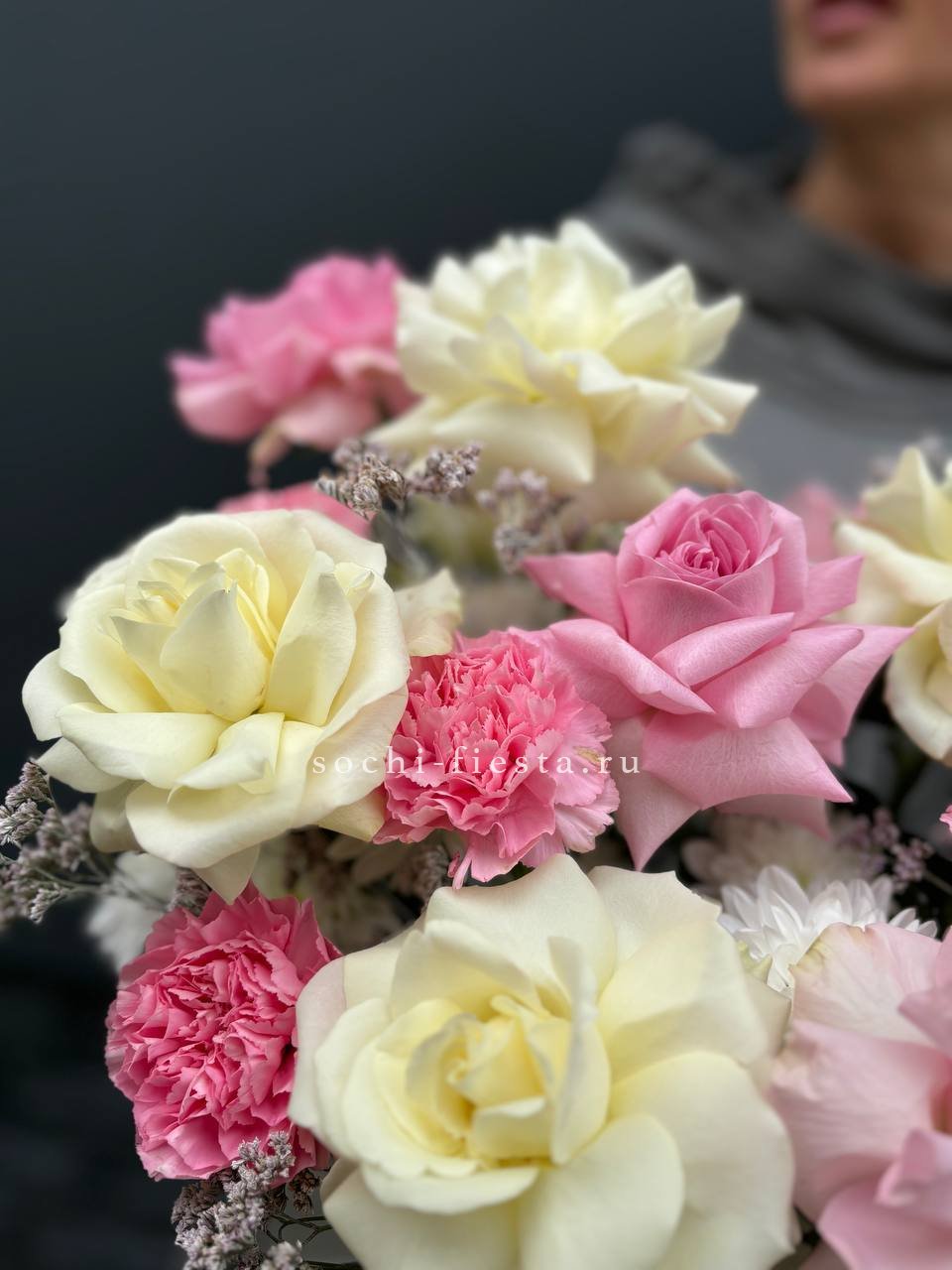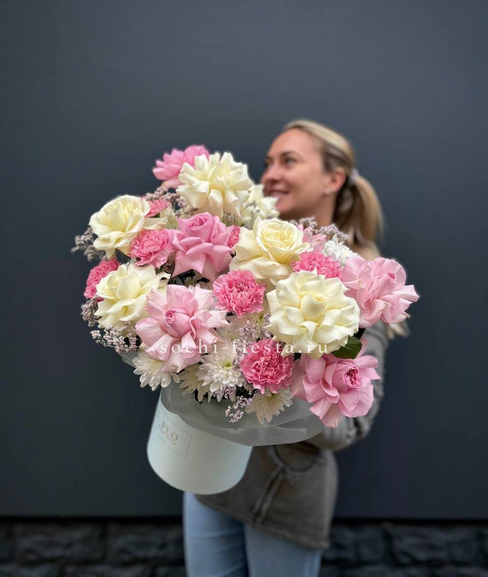 Для заказа товара "Коробка французских роз и диантусов "Бони"" с доставкой в Воронеже нажмите в корзину