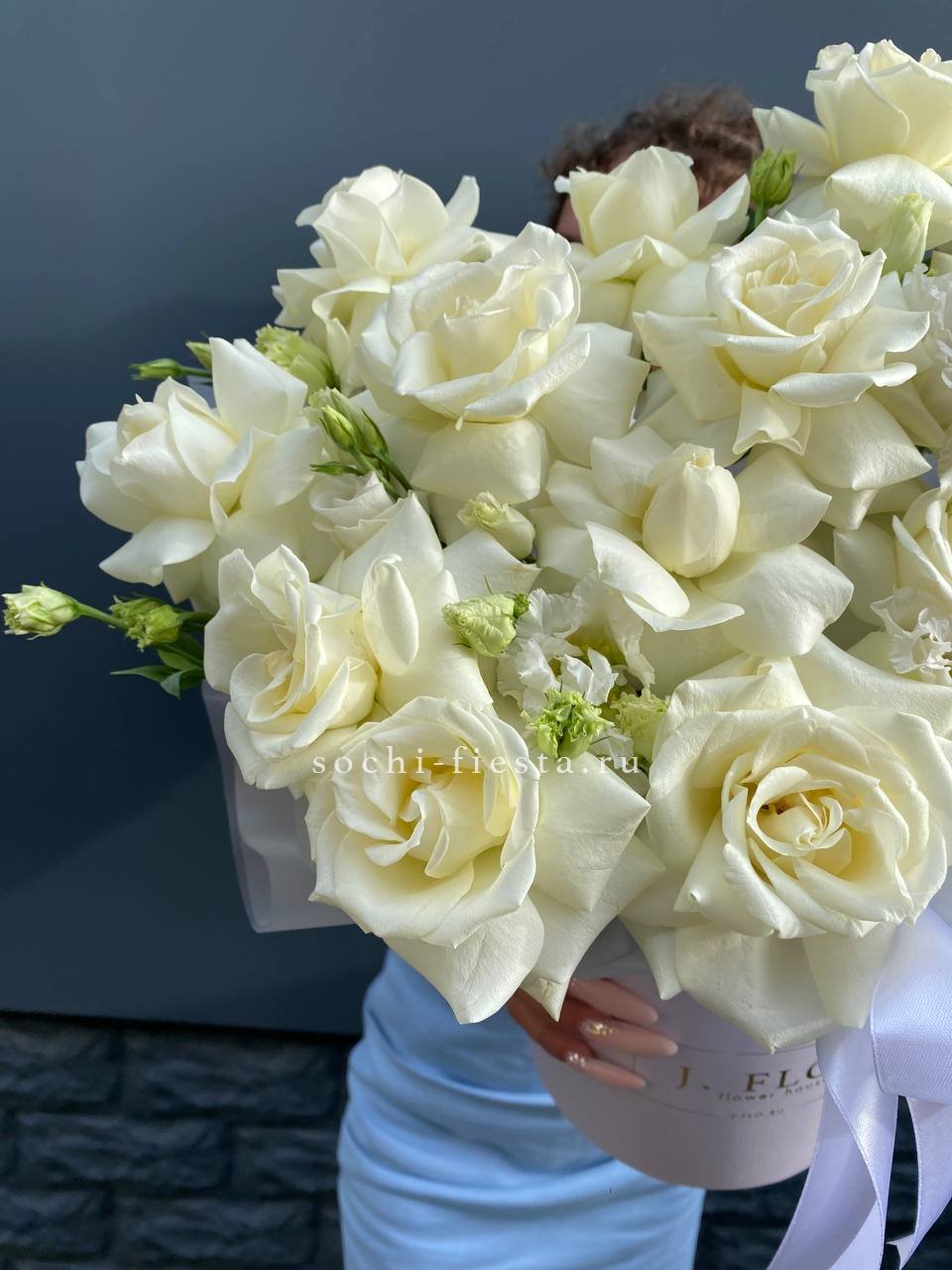 Белые розы и эустома образуют монохромную гамму с чистыми линиями. Эвкалипт добавляет свежести и завершает лаконичную форму композиции.