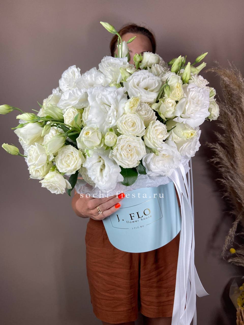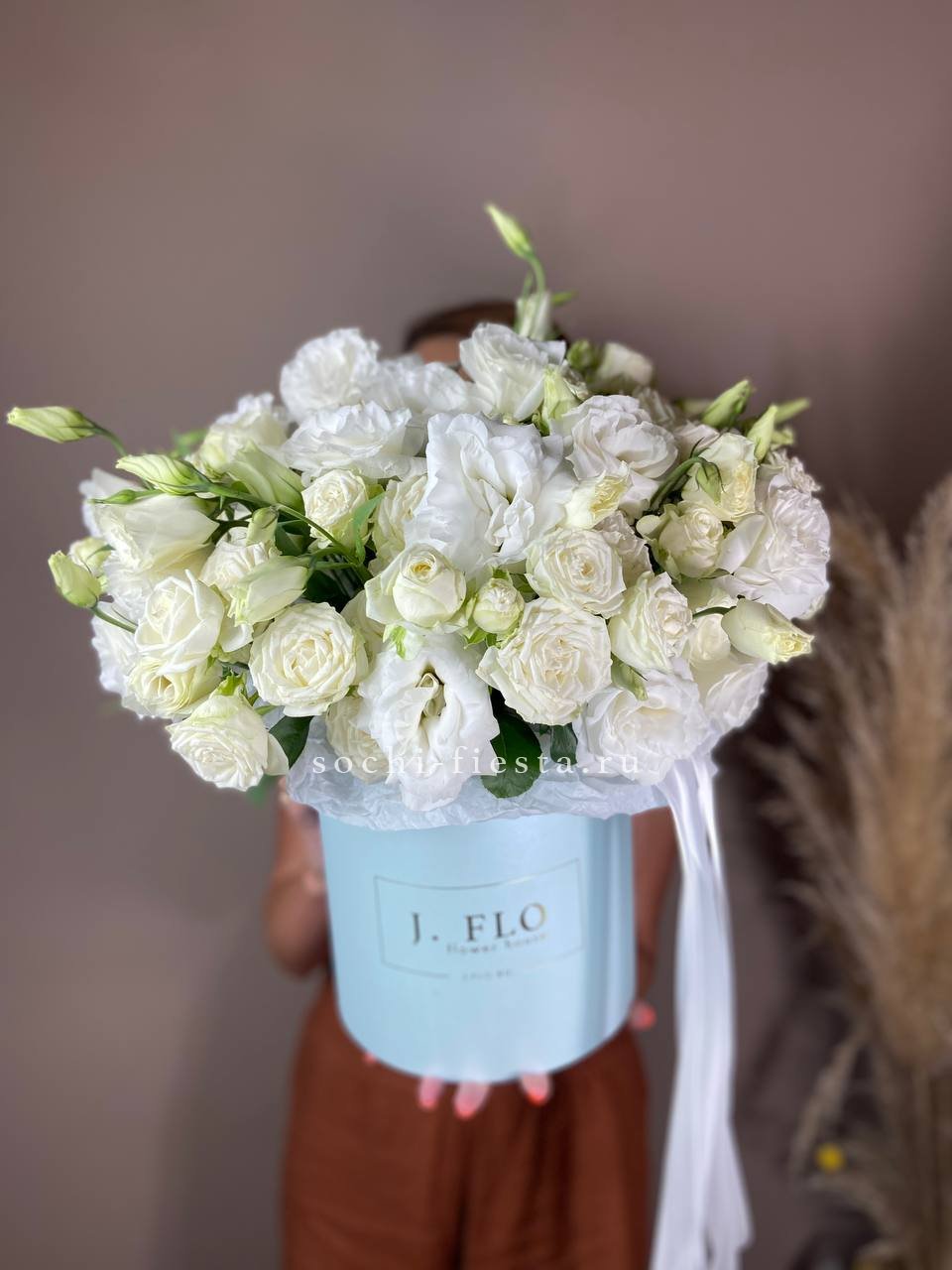Белые розы и эустомы перекликаются с пастельными соцветиями гортензии, а озотамнус добавляет фактурные акценты. Эвкалипт обрамляет композицию серебристыми нотами.