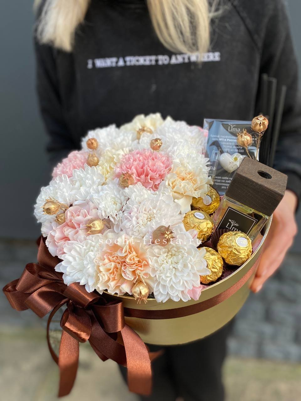 Композиция объединяет живые хризантемы и диантусы с ароматическим диффузором. Цветы сохраняют свежесть долго, а аромат наполняет пространство мягким шлейфом.