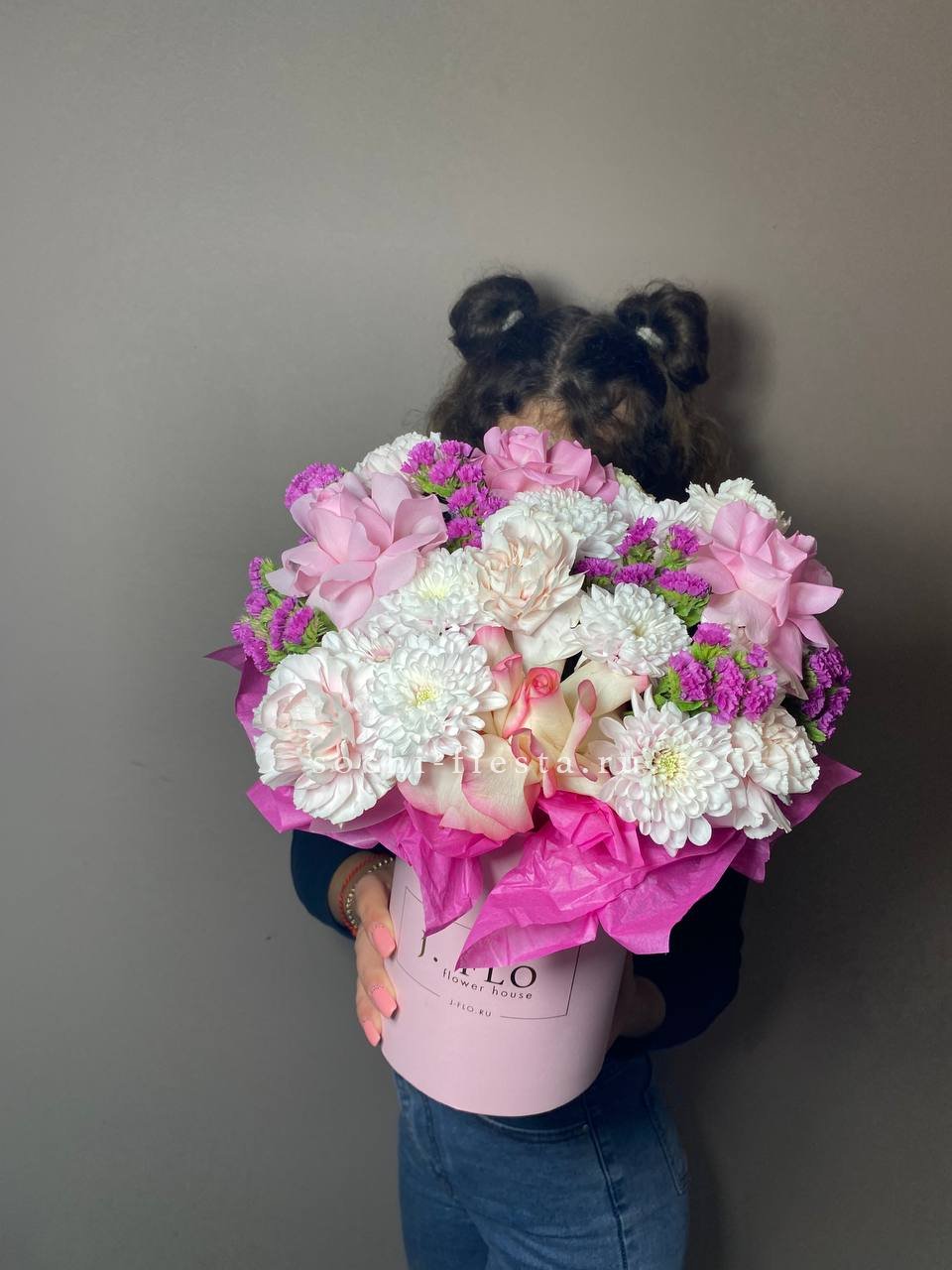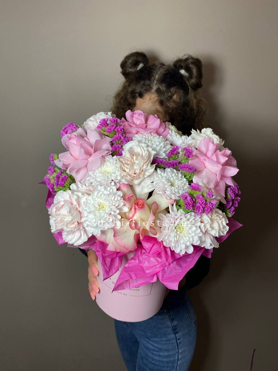 розы, альстромерии, хризантемы, диантусы, цилиндр D13,оазис, тишью.