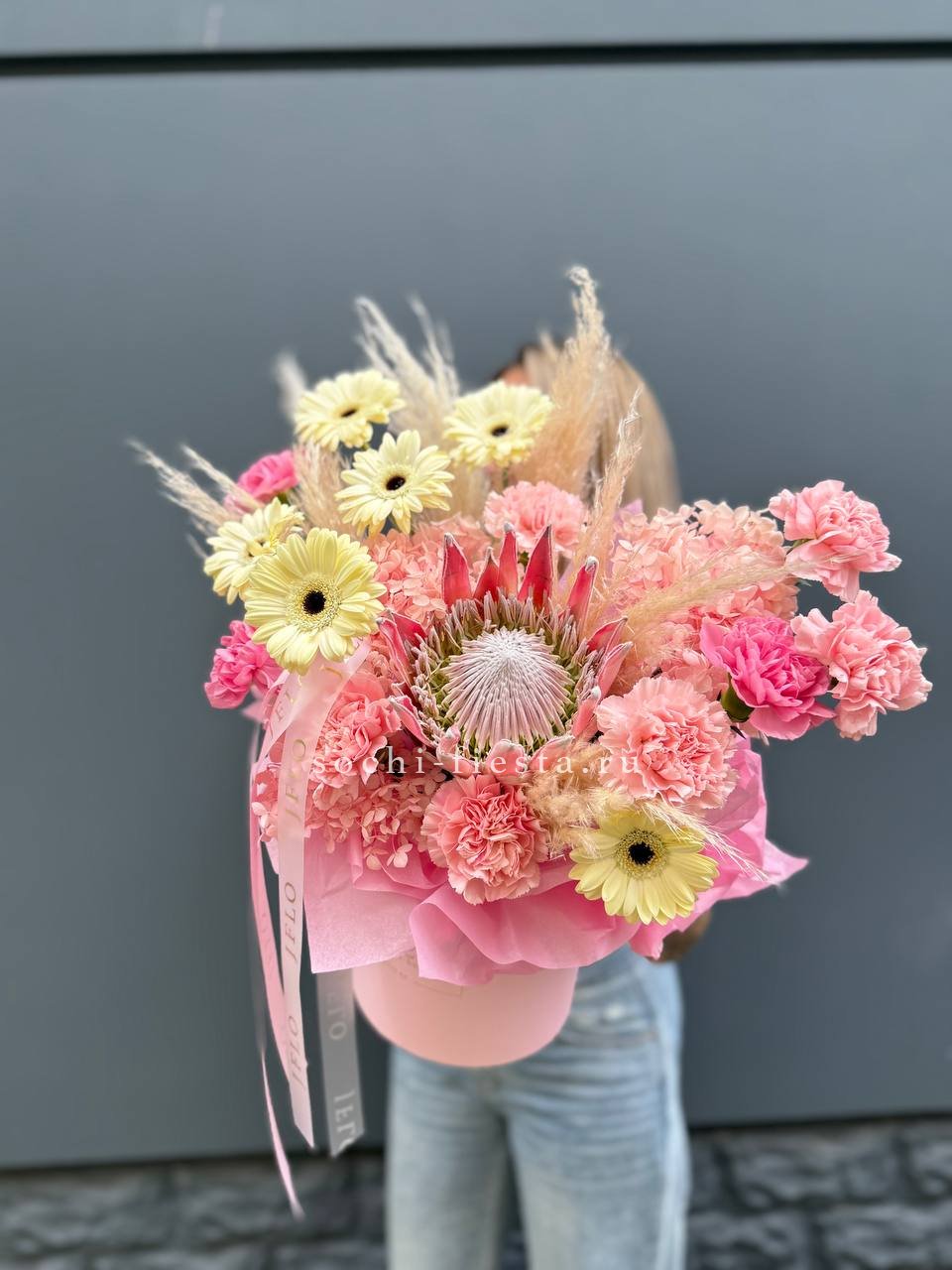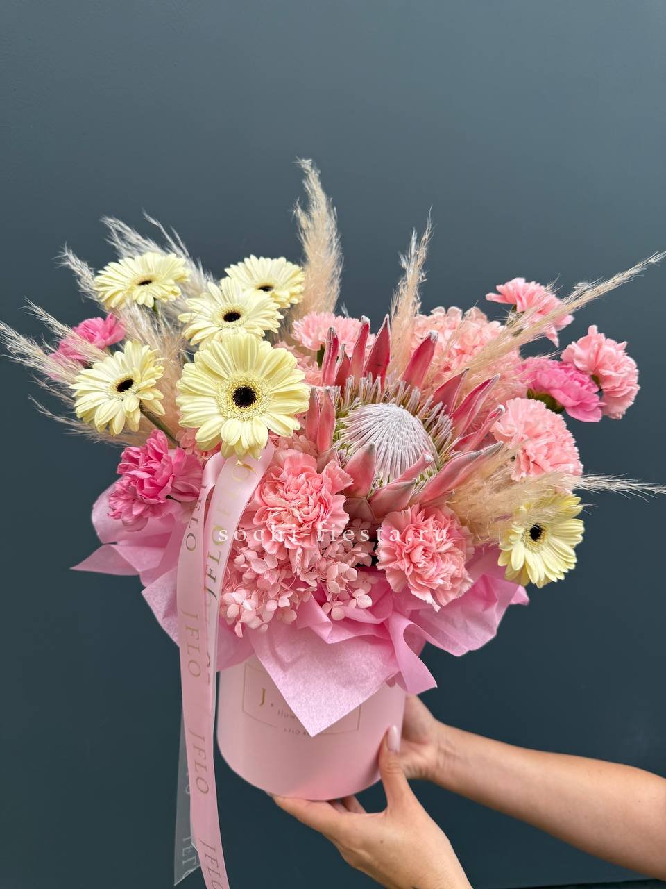 протея, гортензия, герберы, диантусы, картадерия цилиндр D16.