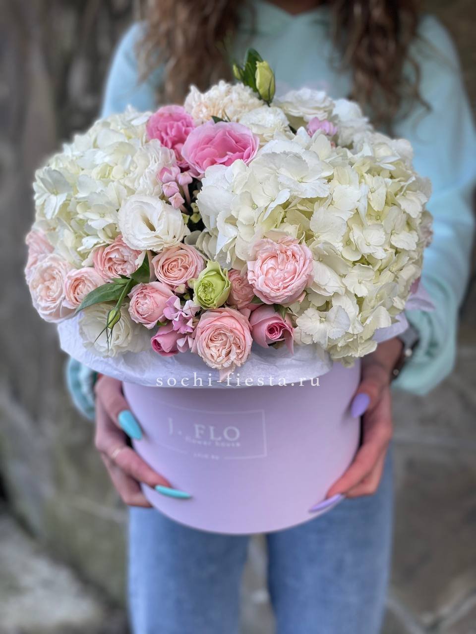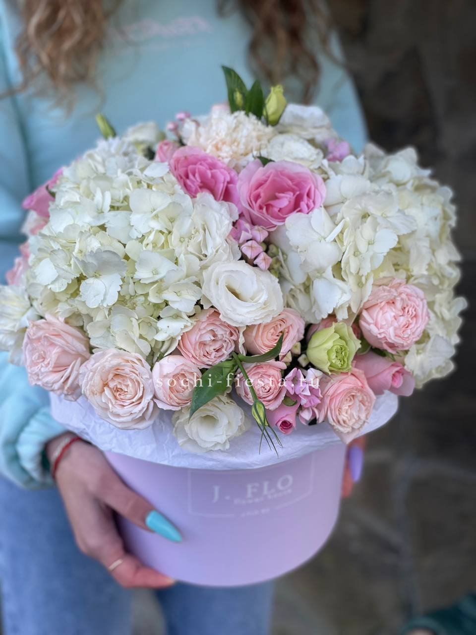 Воздушная композиция в пастельной гамме с акцентом на фактуру раскрытых бутонов. Пионовидные розы и эустома создают объёмный силуэт, а хлопок добавляет графичности.