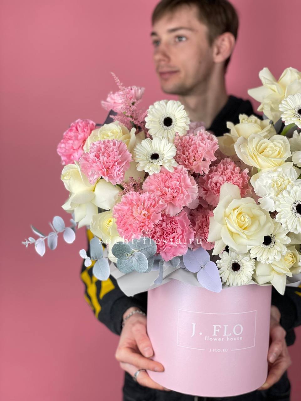 бокс из нежных розово-голубых цветов, розы, герберы, гортензии.