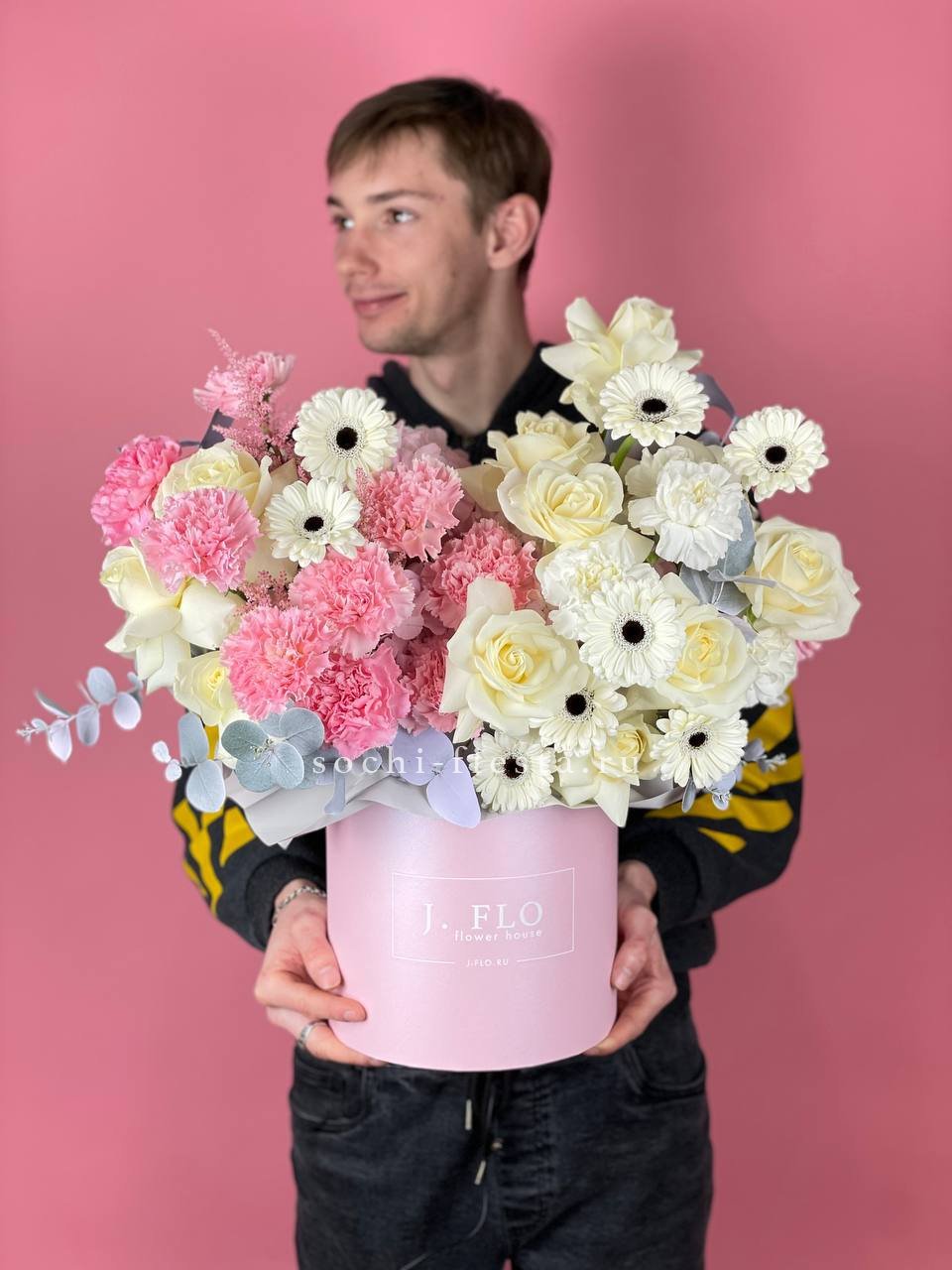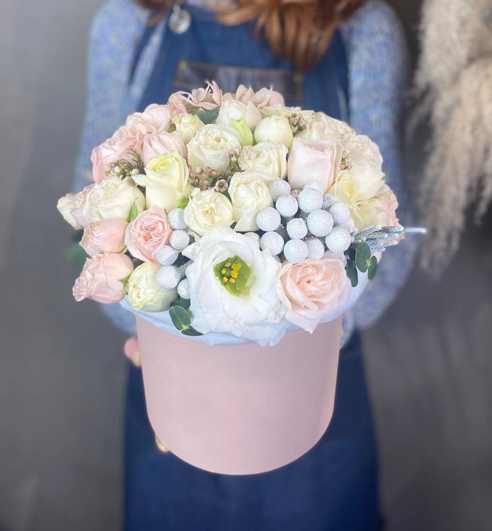 Розы, герберы и пышные соцветия гортензии в розово-голубой гамме наполняют бокс свежестью и легкостью. Каждый цветок раскрывается по-своему, создавая многослойную композицию. Готовое решение для яркого момента.