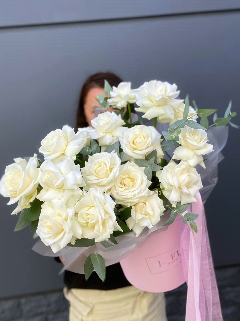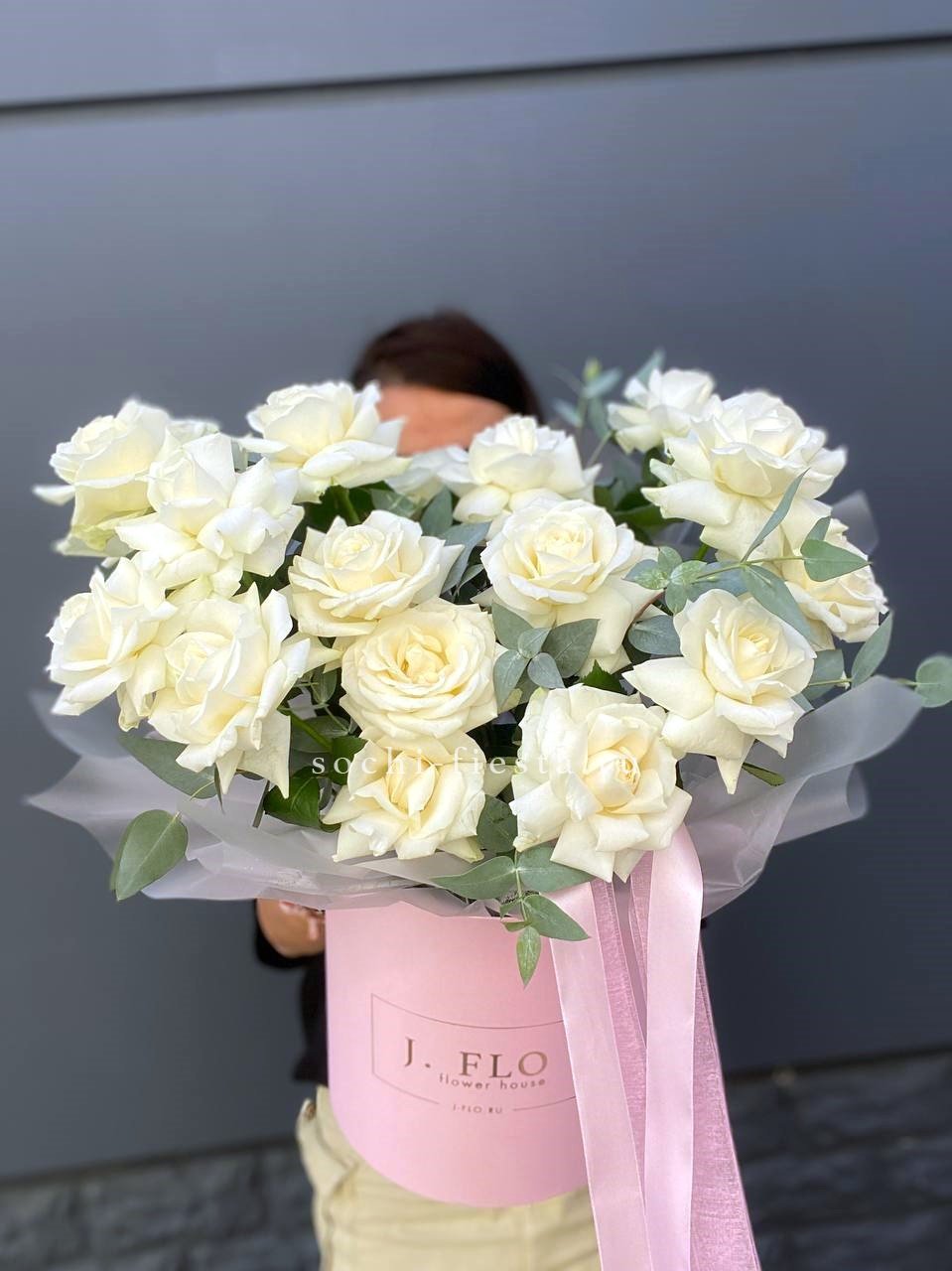 Тридцать пять белоснежных бутонов образуют плотное соцветие безупречной формы. Светлый цилиндр подчеркивает чистоту линий и создает завершенный монохромный образ.
