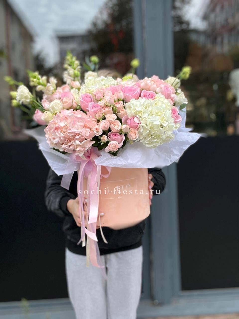 Сиреневая гамма раскрывается слоями от светлых до насыщенных тонов. Композиция заполняет пространство мягким цветом и создаёт воздушное впечатление в просторной коробке.