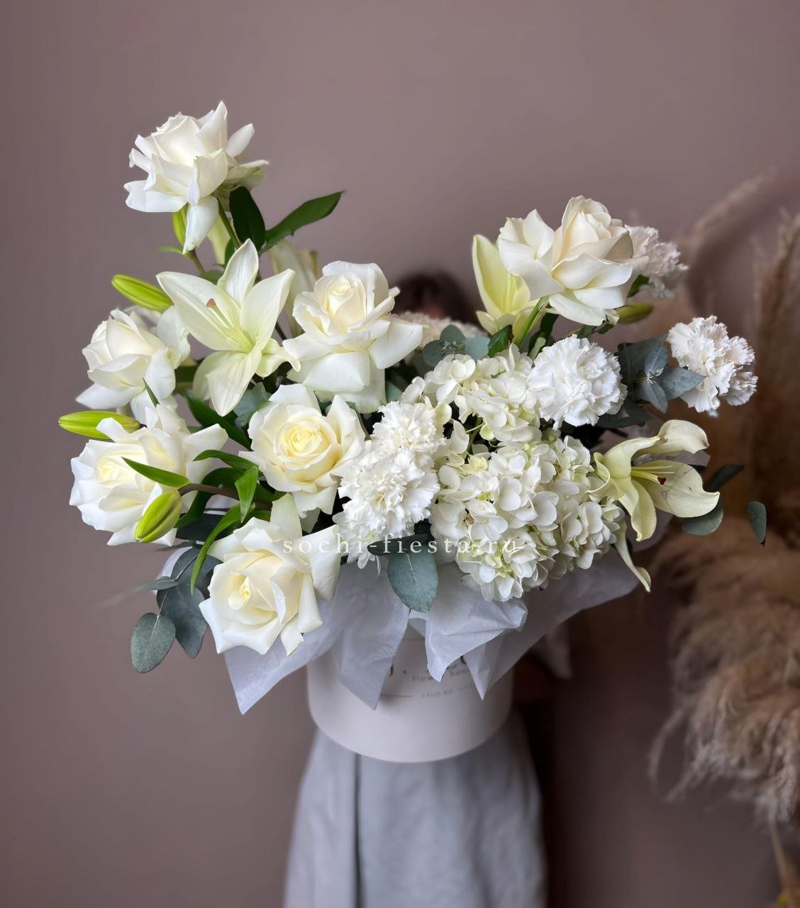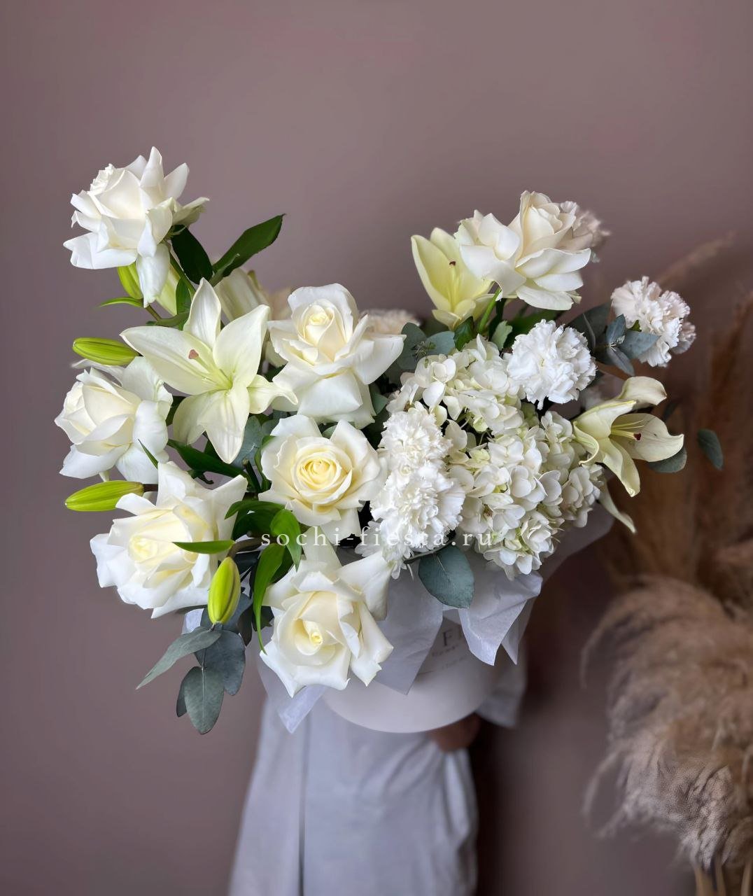 Эвкалипт обрамляет кустовые розы и гортензию, создавая многослойную структуру с зелеными переходами. Эустома добавляет легкости, а цилиндр держит форму аккуратной и собранной.