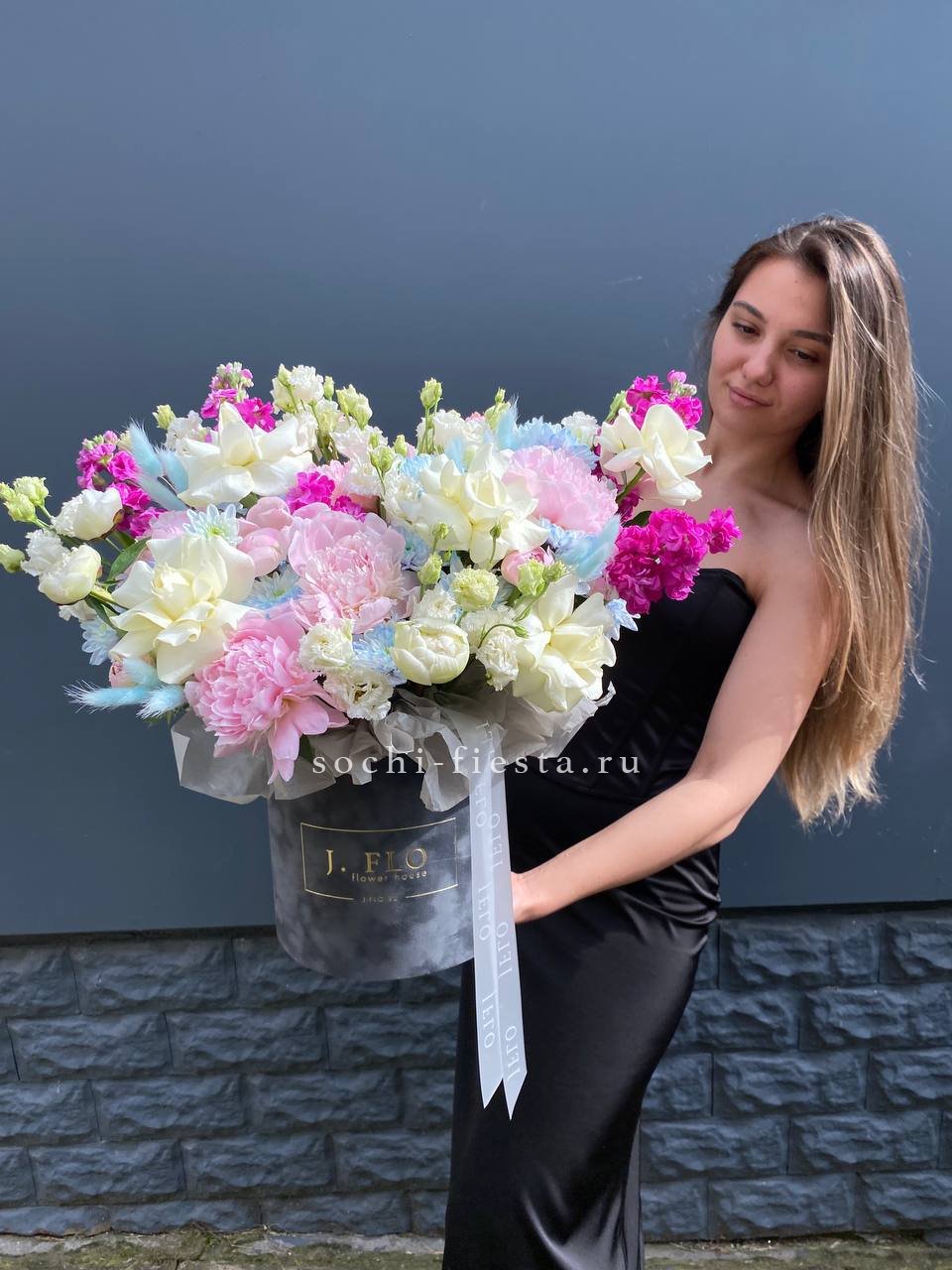 Белоснежные розы и эустома переплетаются с пушистыми соцветиями маттиолы и пионами в бархатном цилиндре. Лагурус добавляет воздушности, а весь образ создаёт ощущение летнего сада в доме.