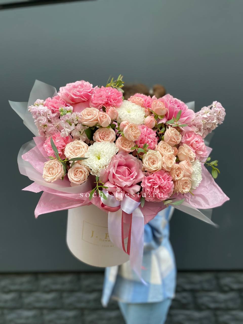 Масштабная композиция в цилиндре собирает пионовидные розы, гортензию и георгины в плотную объемную форму. Высота и диаметр создают выразительное присутствие в интерьере.