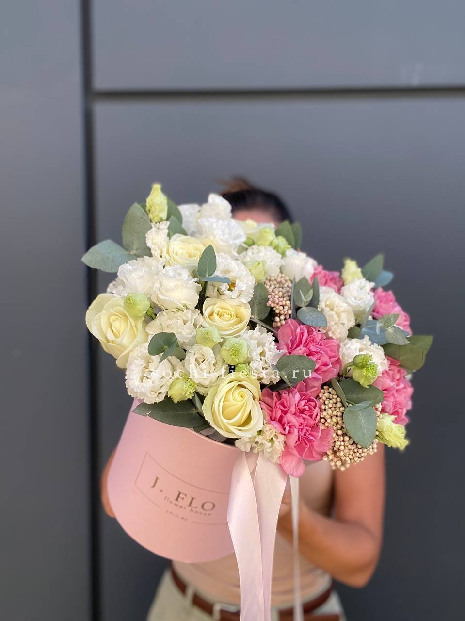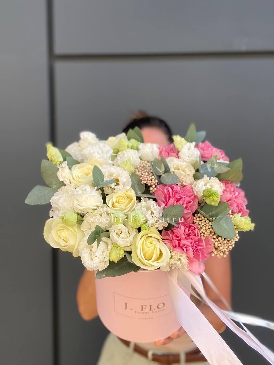 белые розы, диантусы, герберы, эвкалипт, бокс 20.