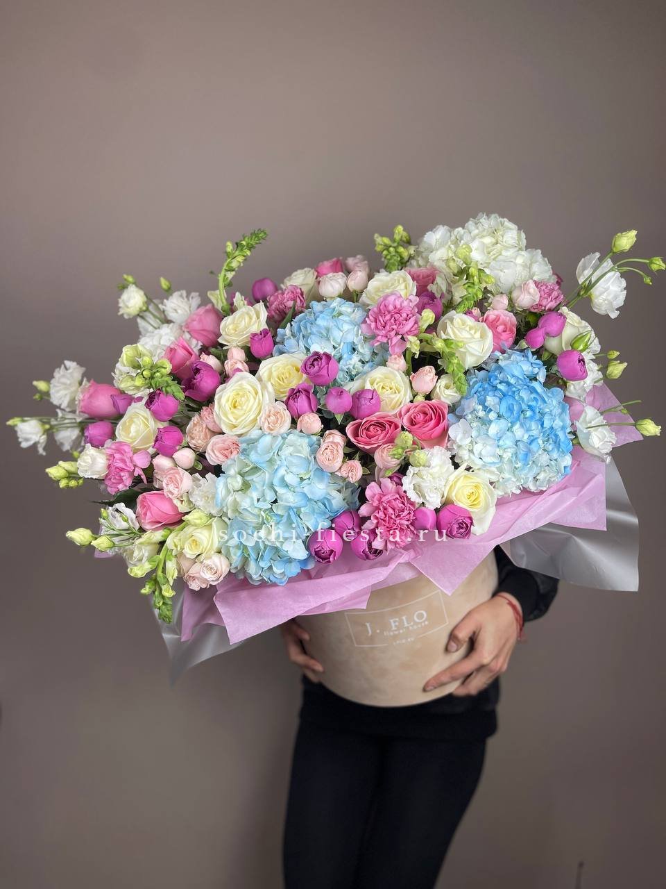 гортензия, диантус, бомбастик, мисти баблс, розы, антиринум, эустома, бокс гигант.