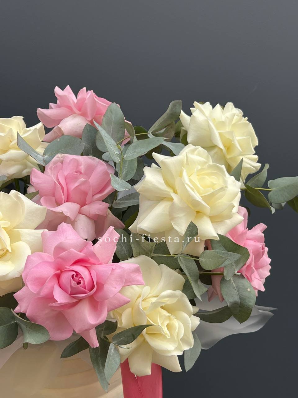 Семнадцать французских роз в пастельном миксе собраны в круглую форму. Композиция компактна и выразительна благодаря сочной зелени эвкалипта.