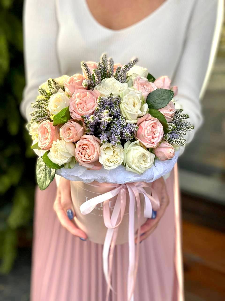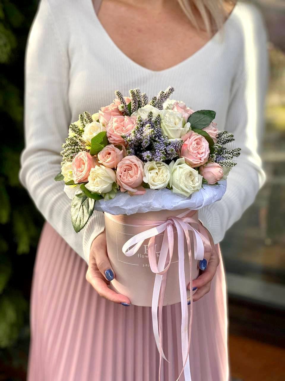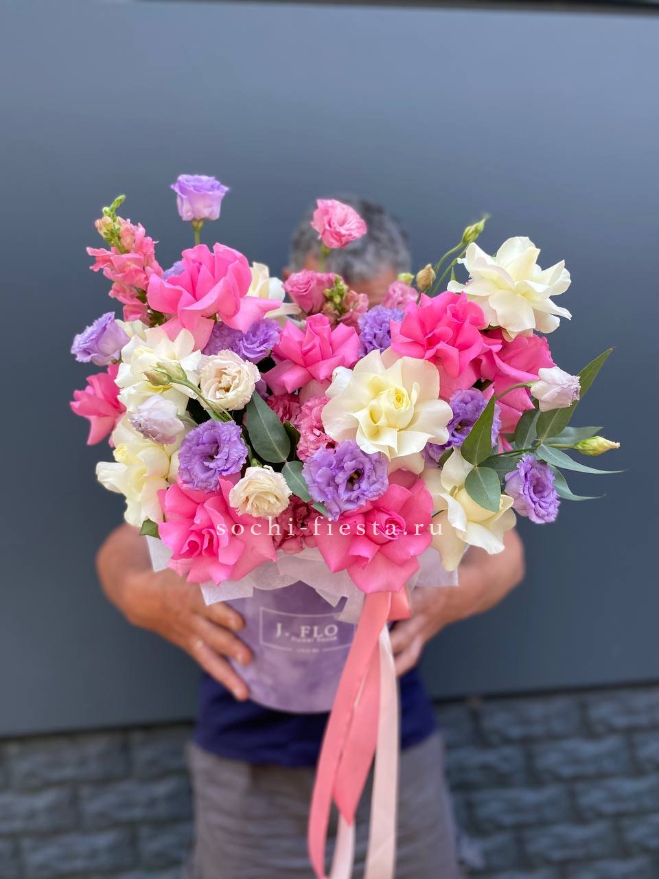 Розовая палитра переходит от французских роз к кустовым Джульетта с добавлением хлопка. Композиция в цилиндре сочетает воздушность и плотность фактур.