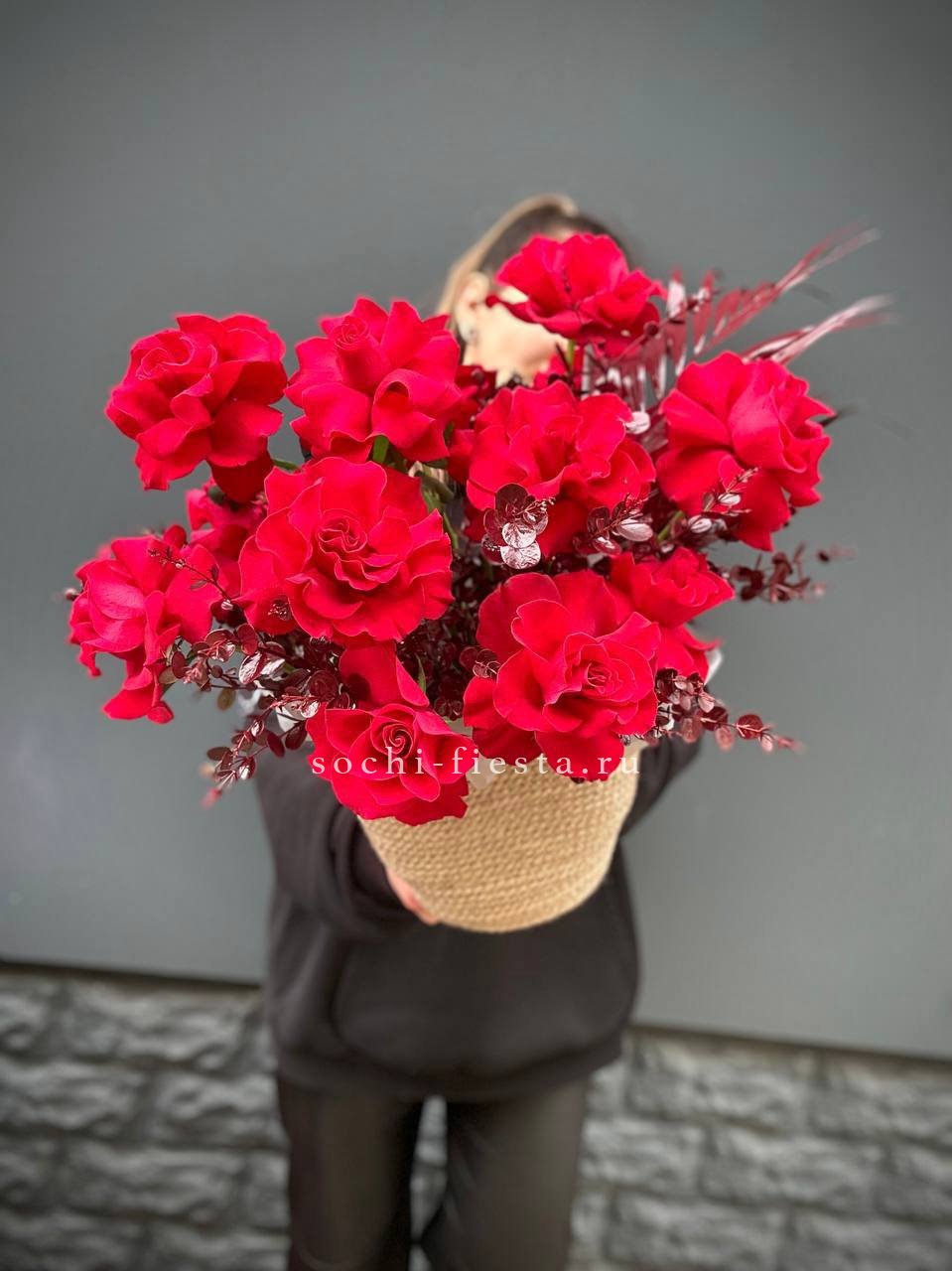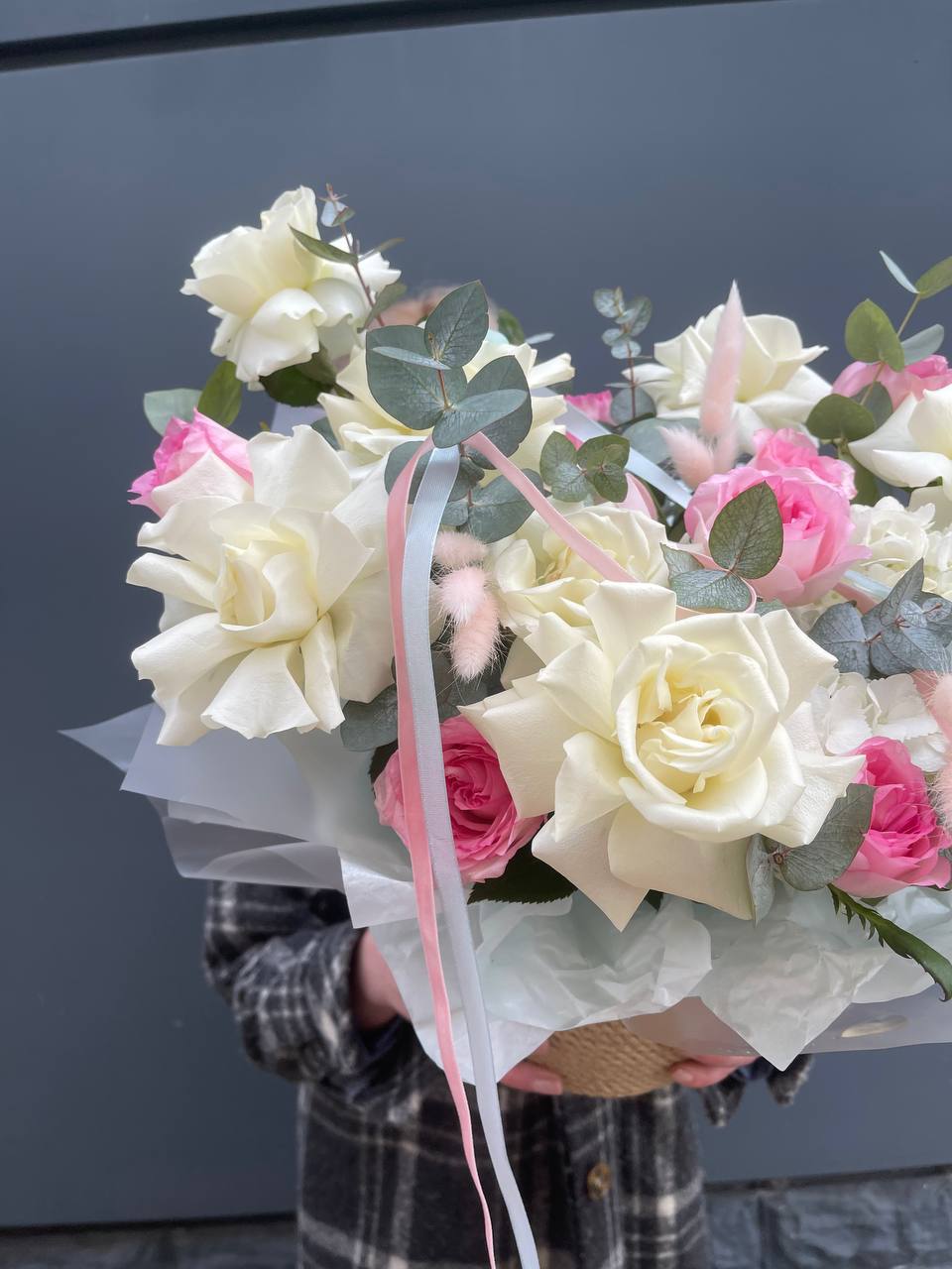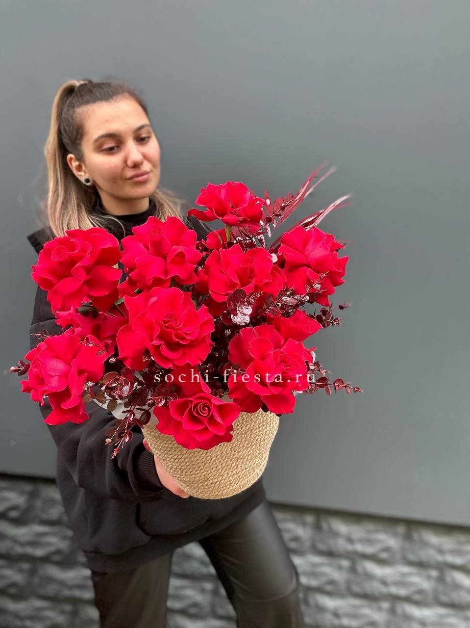 Французские розы теплого оттенка раскрываются в окружении эвкалипта и листьев Чико. Композиция в джутовом кашпо выглядит самодостаточно и гармонично вписывается в любое пространство.