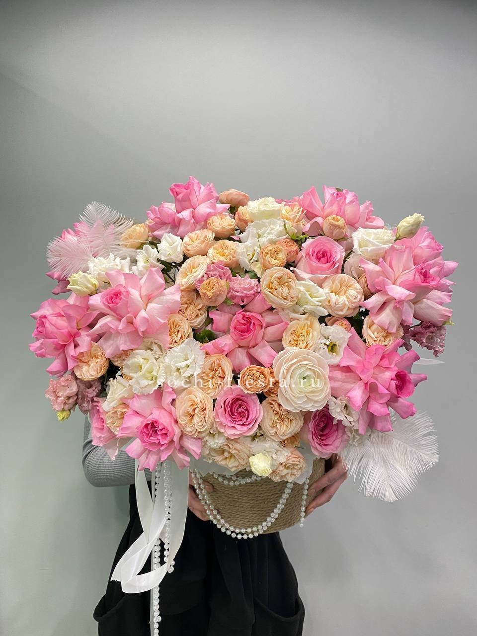 Розовые розы и пионовидные кустовые создают пышный объем, дополненный ранункулюсами и эустомой. Декоративные бусы и перья придают композиции театральность, словно застывший момент балетного выступления.