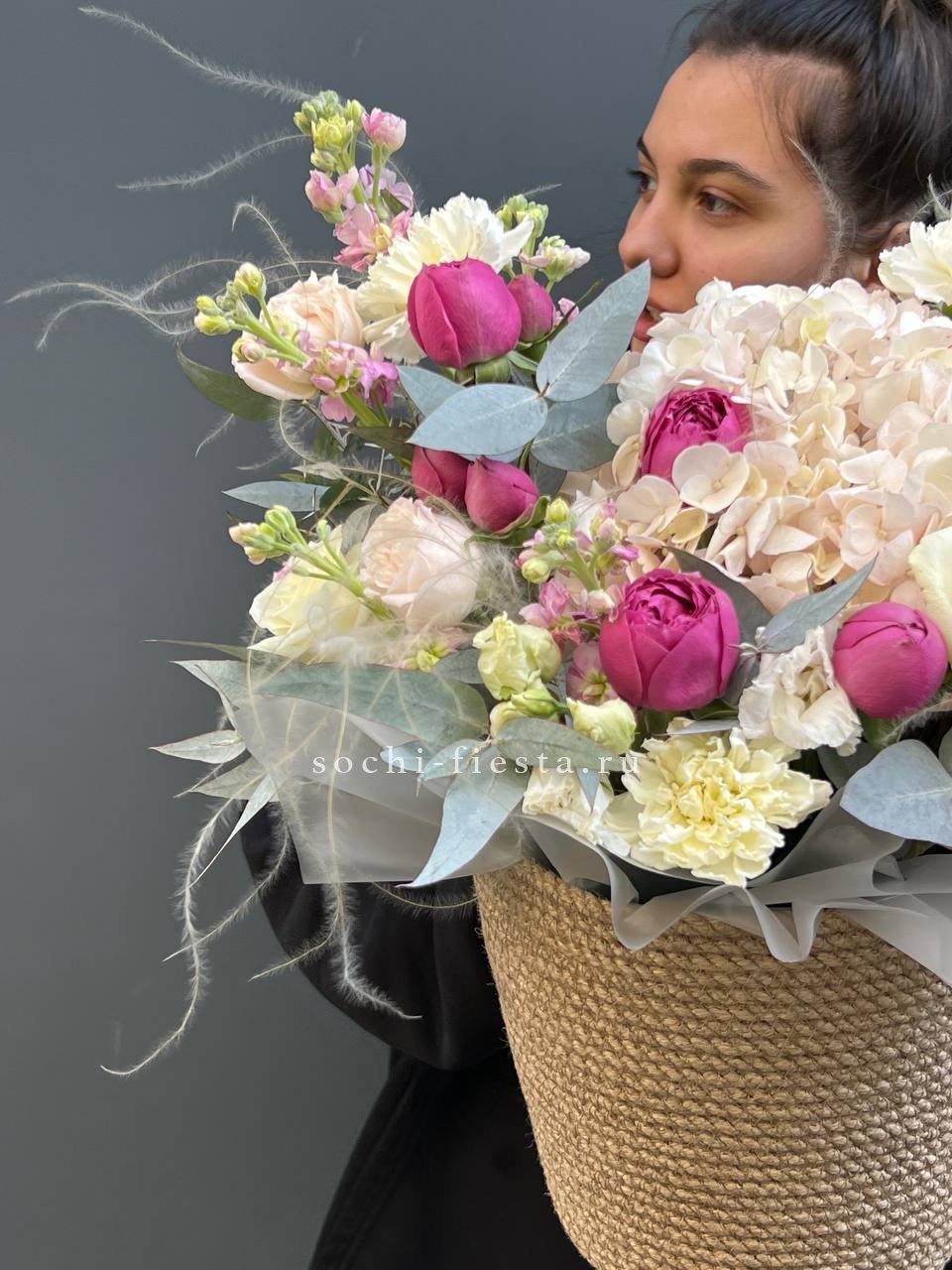 Экзотичная протея задаёт тон всей композиции, где розовые и красные розы переплетаются с фактурным озатамусом. Диантус добавляет графичности, а эвкалипт смягчает линии.
