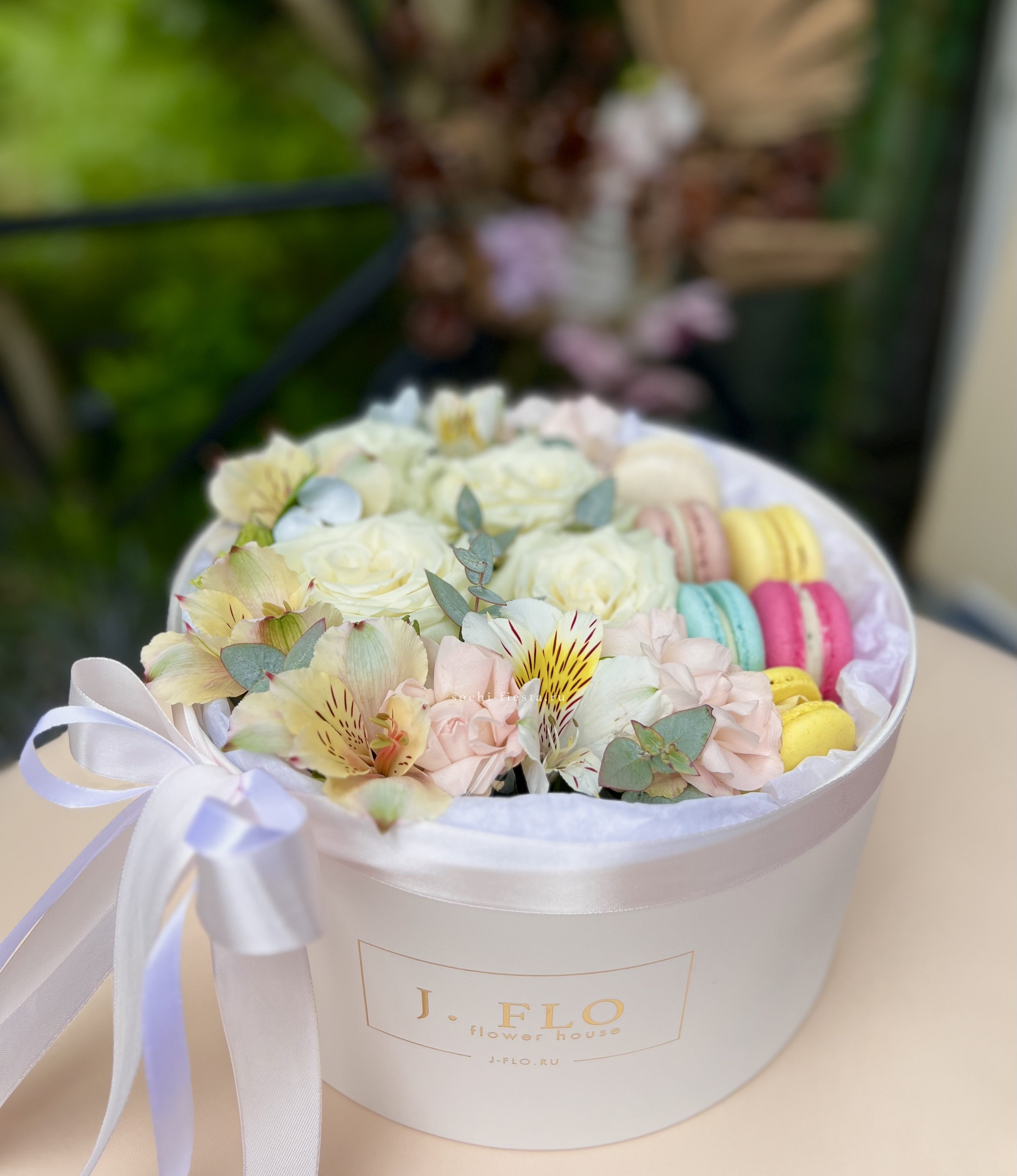 комбинация цветочных элементов нежных оттенков, включая розы и диантусы, круглая коробка D20, 11 макаронс.