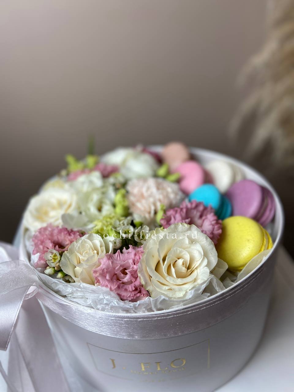 розы, пионовидные розы Мисти Баблс и бомбастик, розовая круглая коробка D20, 6 макаронс.