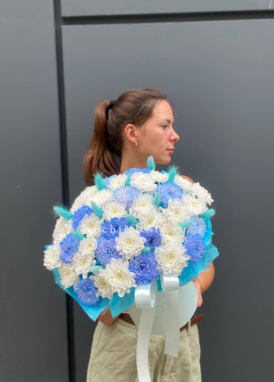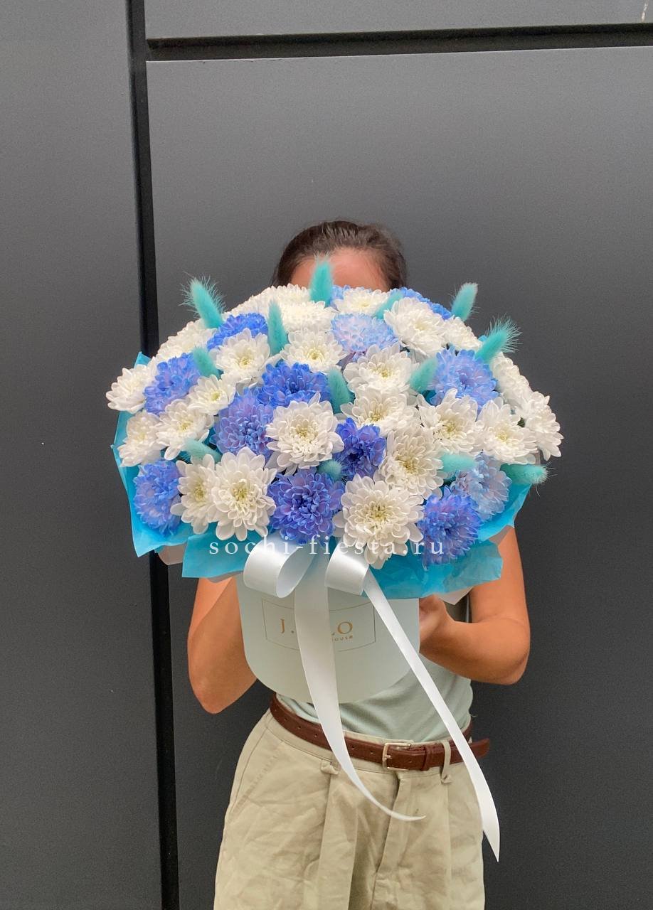 Пушистые соцветия хризантем и воздушный лагурус собраны в компактную коробочку. Голубая гамма напоминает морской бриз и летний день у воды.