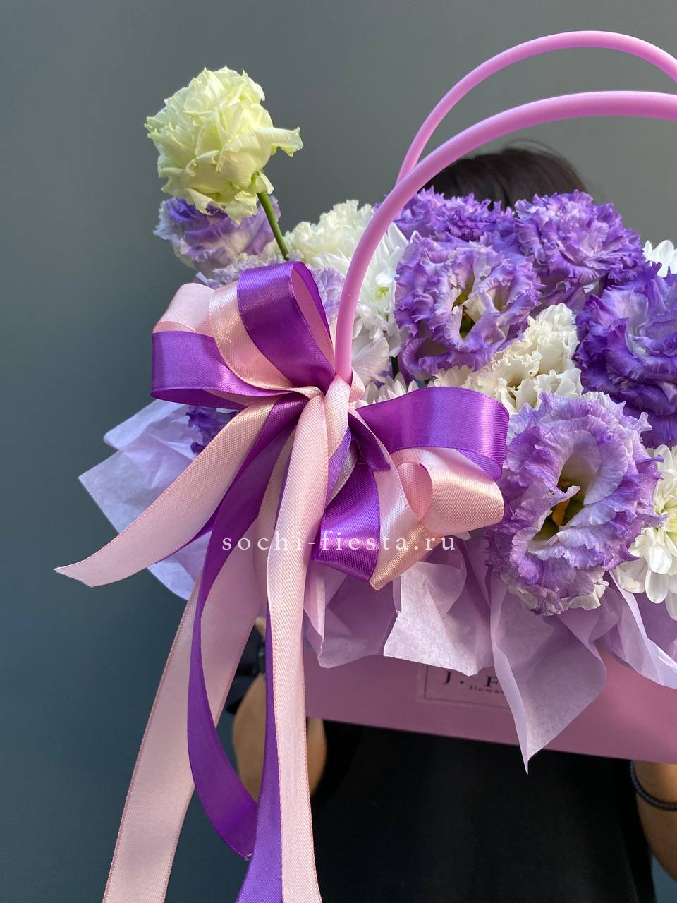 эустома, хризантемы кустовые, лента, сумка-кашпо.