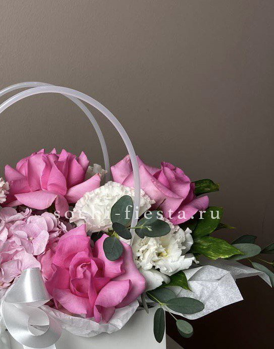 гортензия, розовые розы, эустома, диантусы,эвкалипт, лента, сумка-кашпо.
