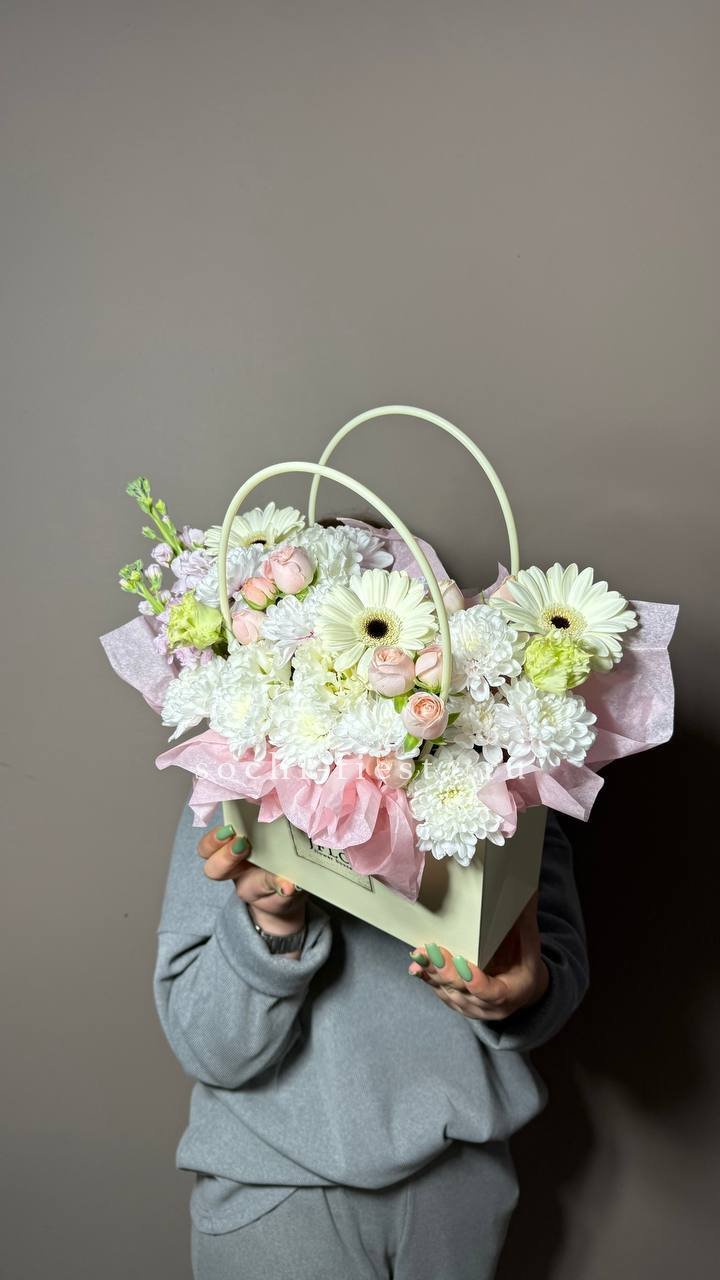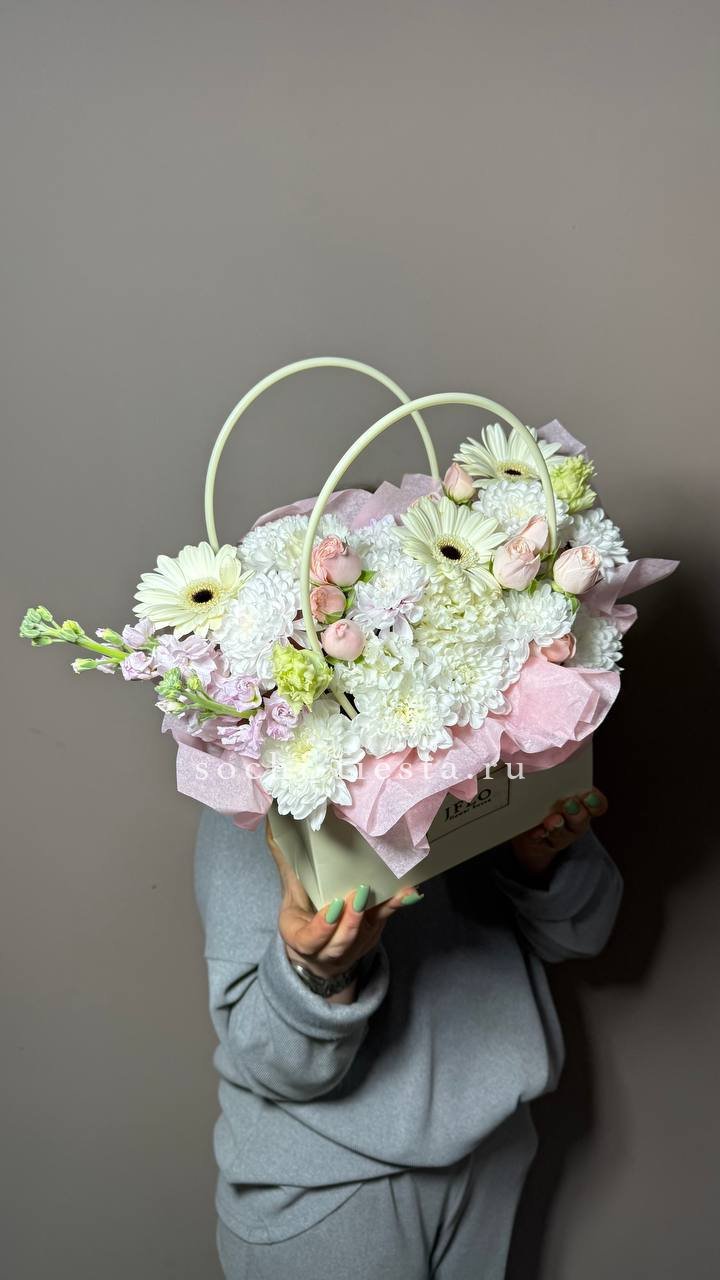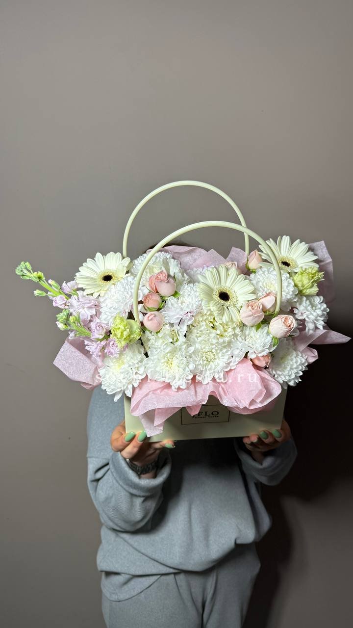 Белоснежные хризантемы и эустома создают светлое облако, которое разбавляют акценты гербер и душистой маттиолы. Композиция в сумочке готова к вручению сразу после получения.