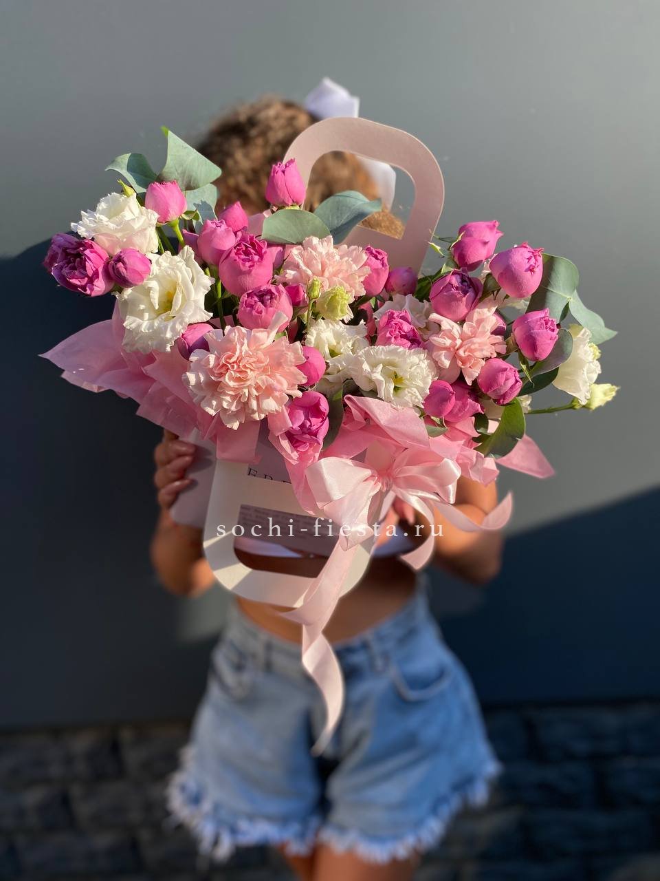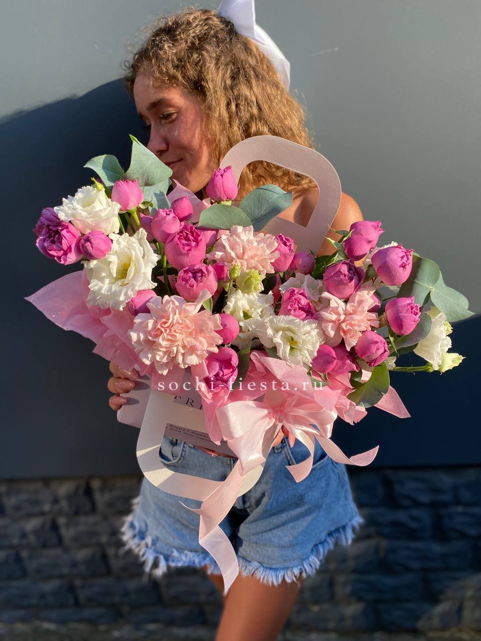 Хризантемы и маттиола собраны в компактную форму с лиловыми переливами. Статица добавляет воздушности, а сумочка делает композицию мобильной и готовой к вручению. Цветы закреплены в оазисе для длительной свежести.