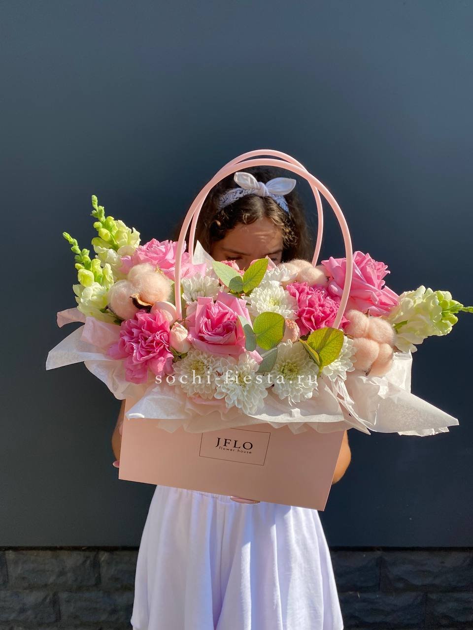 Воплощение изысканности и тренда! Эта стильная композиция в розовой сумочке объединяет в себе яркие цветовые акценты и современный флористический дизайн. Она идеально подойдет для модного образа или в качестве креативного подарка для ценителей необычных решений. Безупречный вкус в каждой детали.