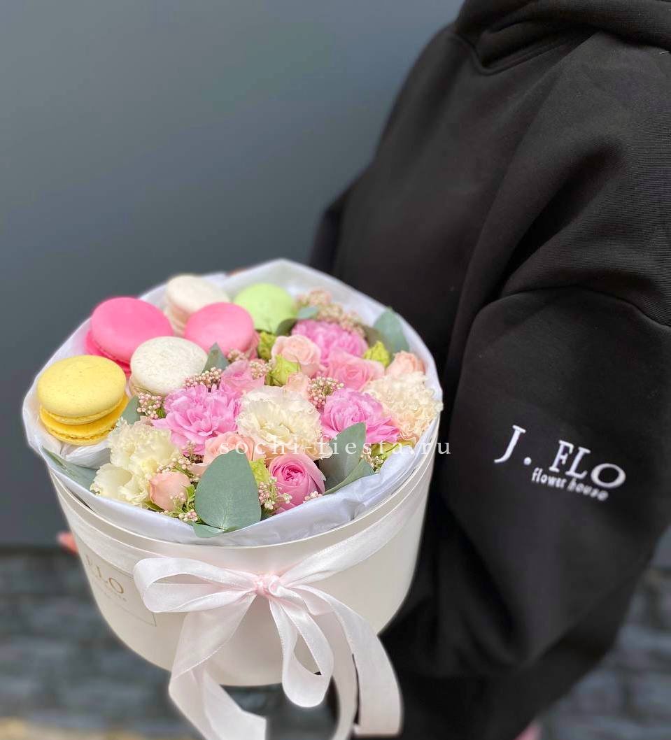 Пудровые оттенки роз и эустомы образуют мягкую цветовую гамму в компактной коробке. Шесть макаронс дополняют композицию и создают завершённый образ. Решение для корпоративного поздравления в спокойной палитре.