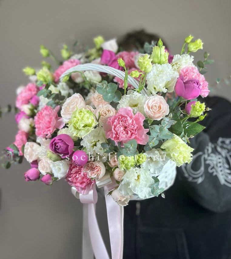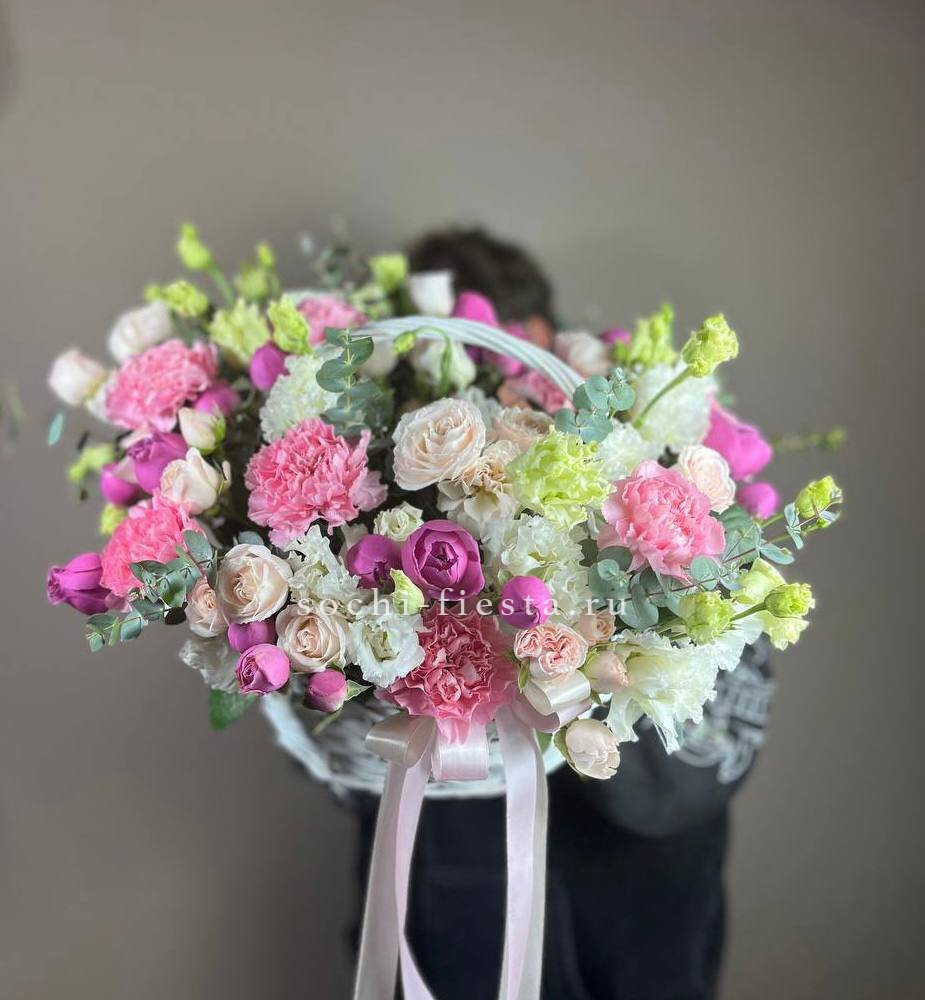 Пышные шапки гортензии и яркие бомбастики собраны в корзину с плавными переходами оттенков. Композиция держит форму и создаёт объёмное цветовое пятно в любом пространстве.